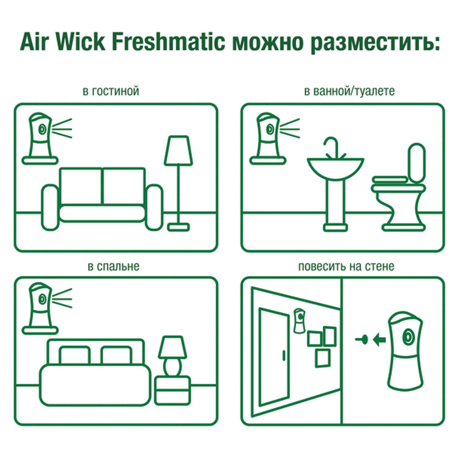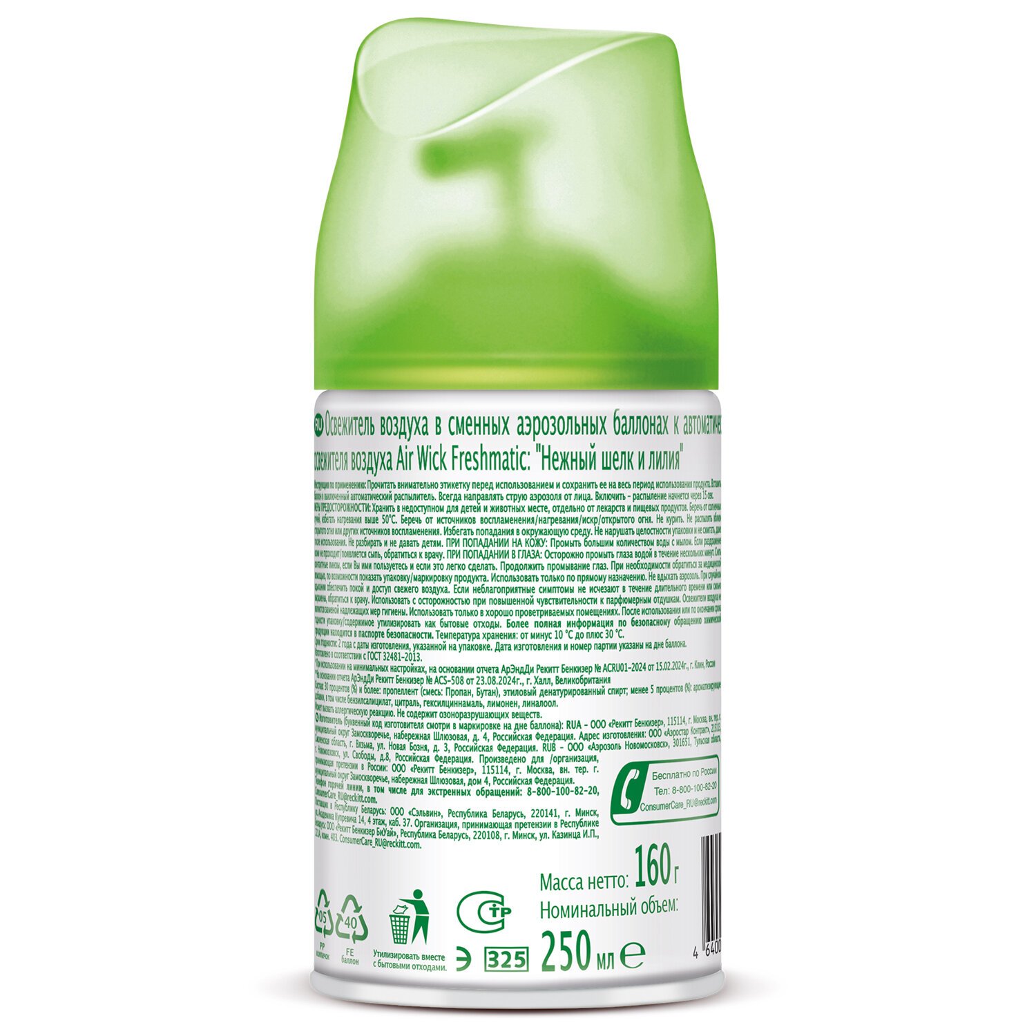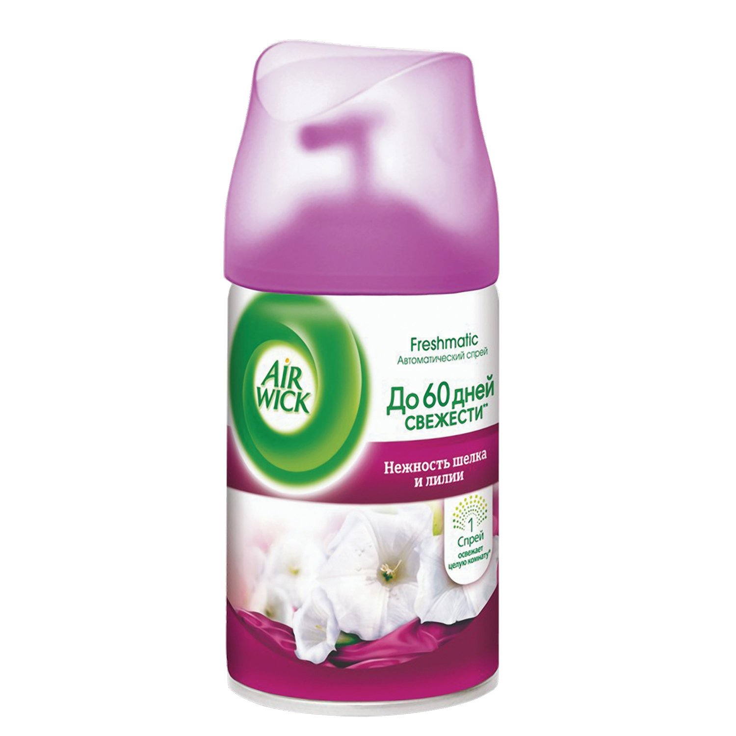 Освежитель воздуха в сменных аэрозольных баллонах к автоматическому распылителю освежителя воздуха AIRWICK Freshmatic "Нежный шелк и лилия". Самостоятельно распыляет аромат и эффективно устраняет любые неприятные запахи.