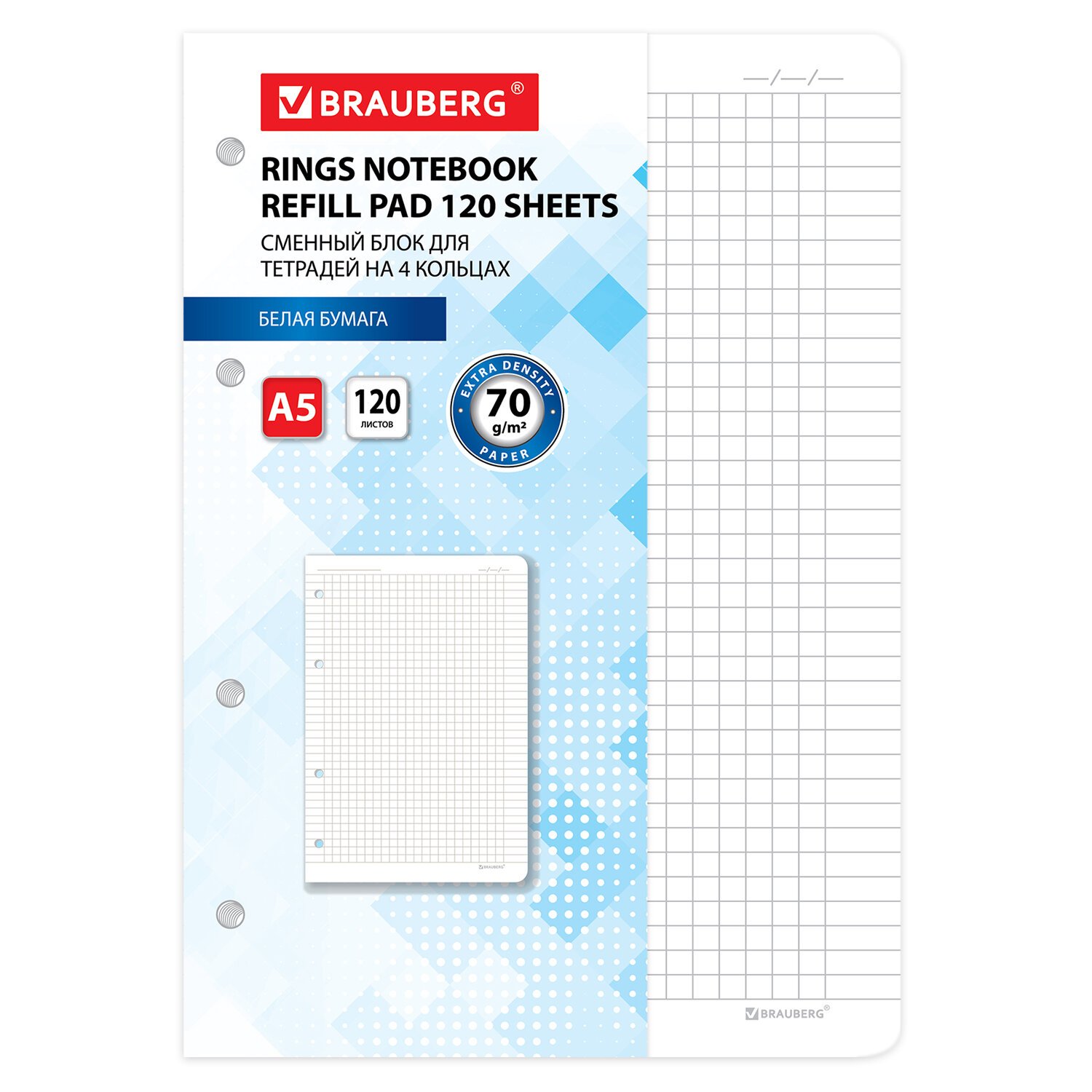 Сменный блок для тетради на кольцах А5 120 л., BRAUBERG, ПОВЫШЕННОЙ ПЛОТНОСТИ, белый, 403638