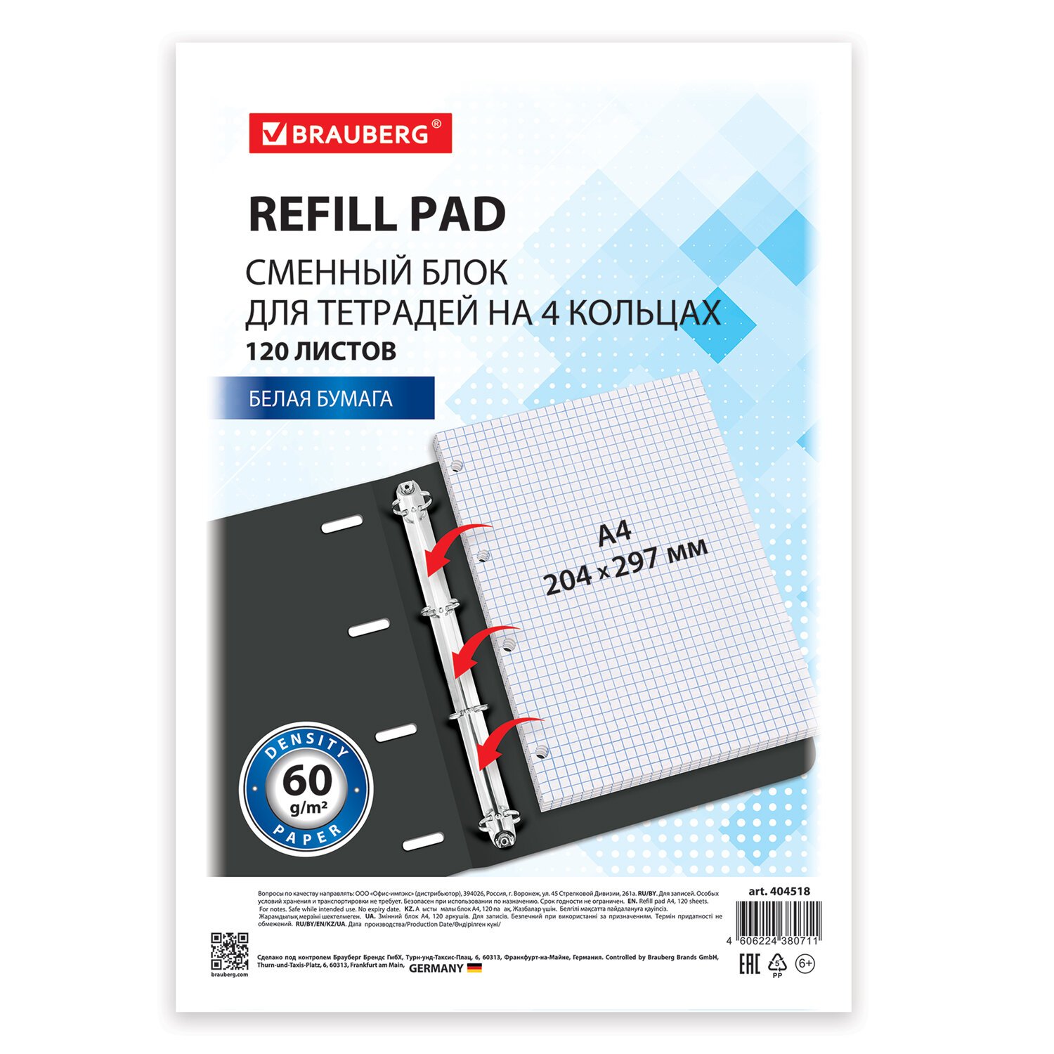 Подходит для всех тетрадей на кольцах формата А4. Внутренний блок содержит 120 листов белой офсетной бумаги плотностью 60 г/м2. Линовка – в клетку, без полей. Упакован в термопленку.