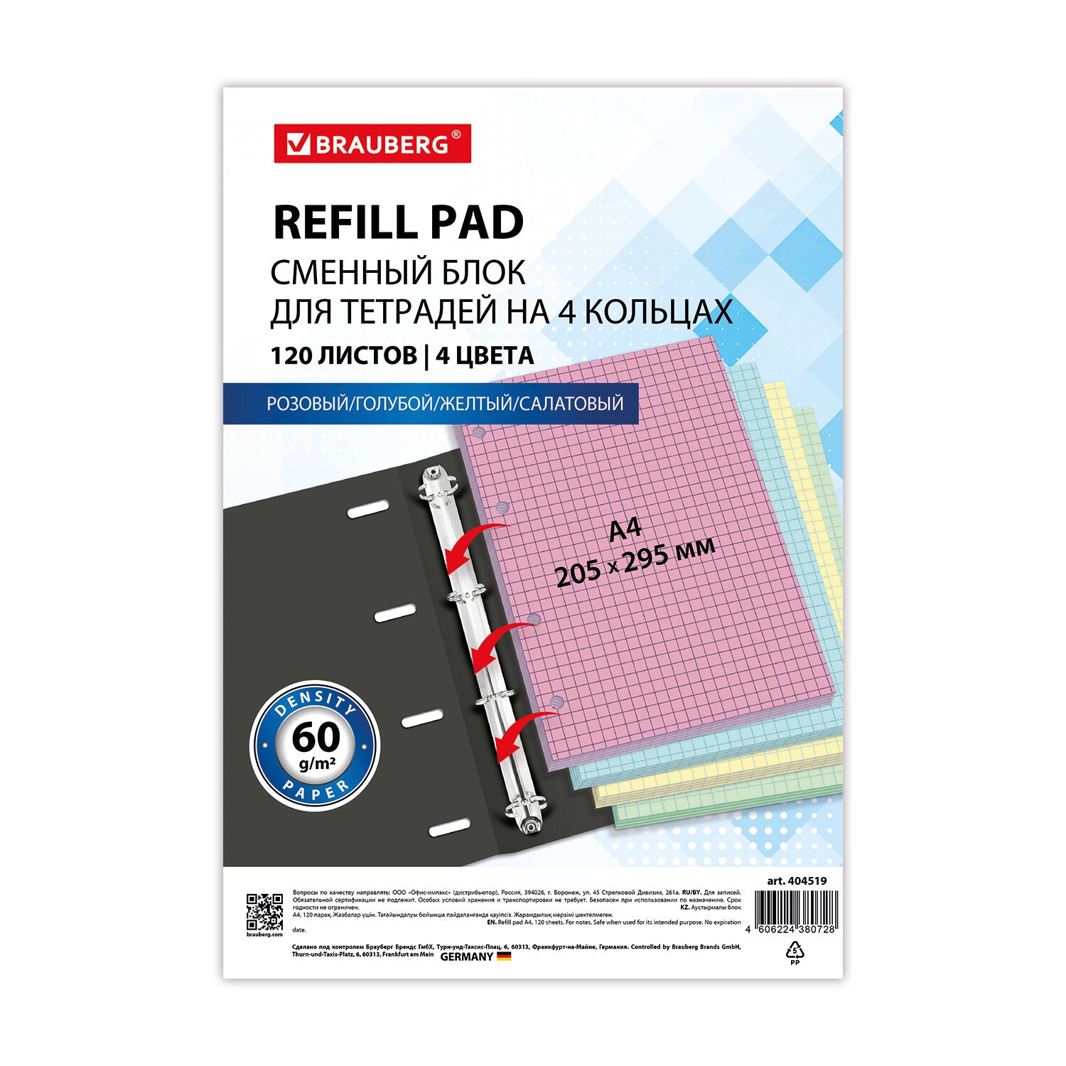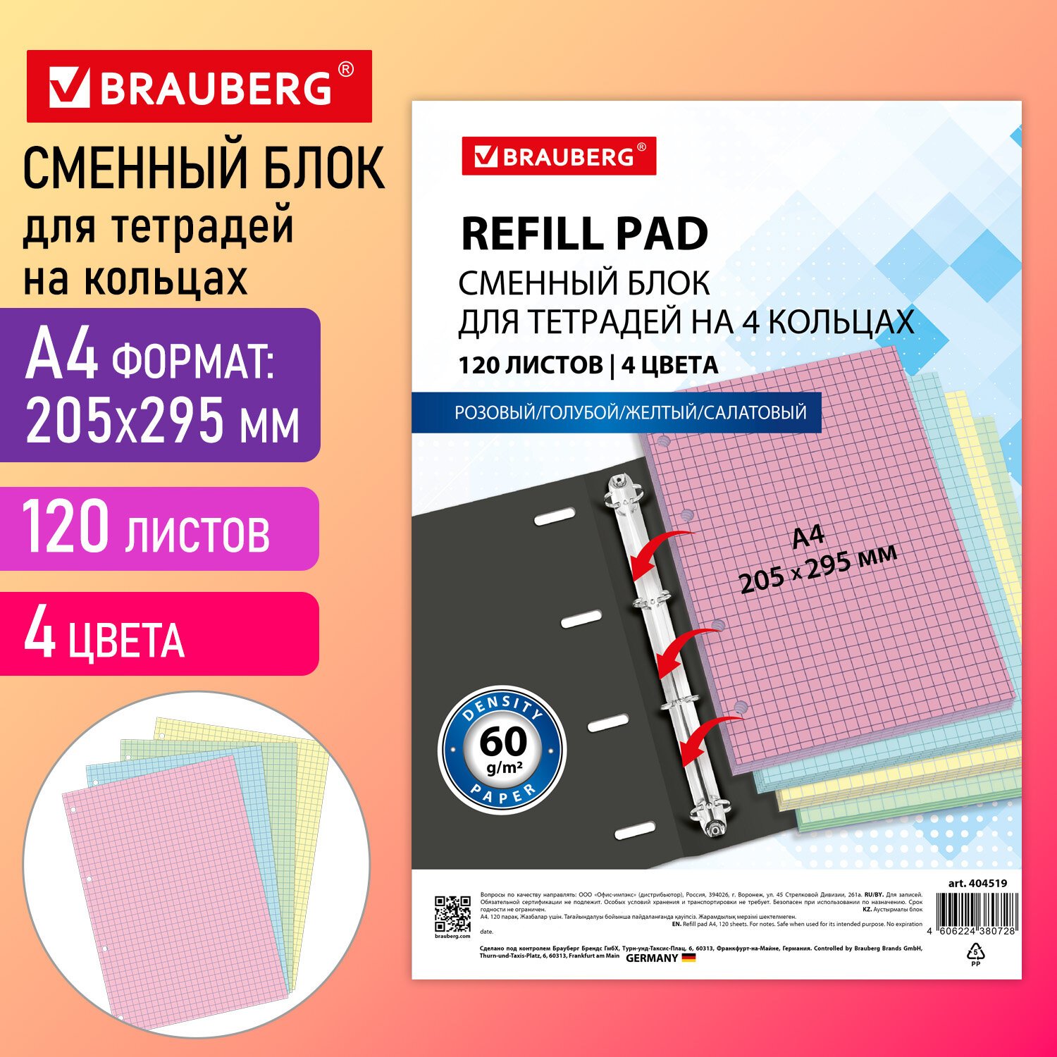 Сменный блок к тетради на кольцах БОЛЬШОЙ ФОРМАТ А4, 120 л., BRAUBERG, (4 цвета по 30 листов), 404519