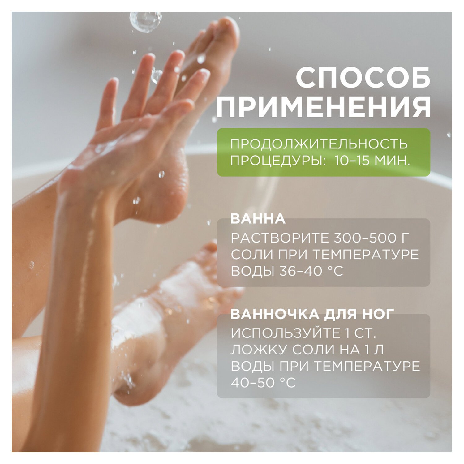 Натуральная магниево-сульфатная соль для ванн обеспечивает бережное очищение и эффективное смягчение.