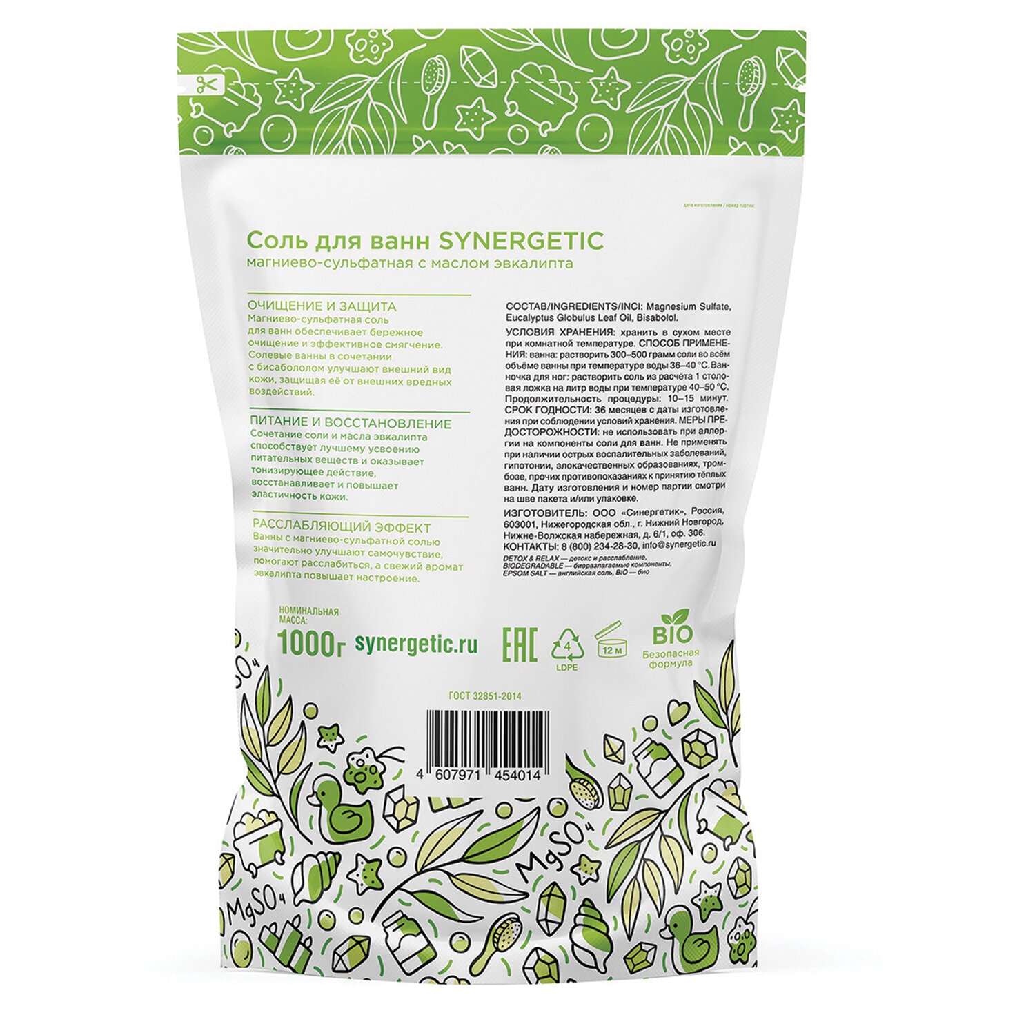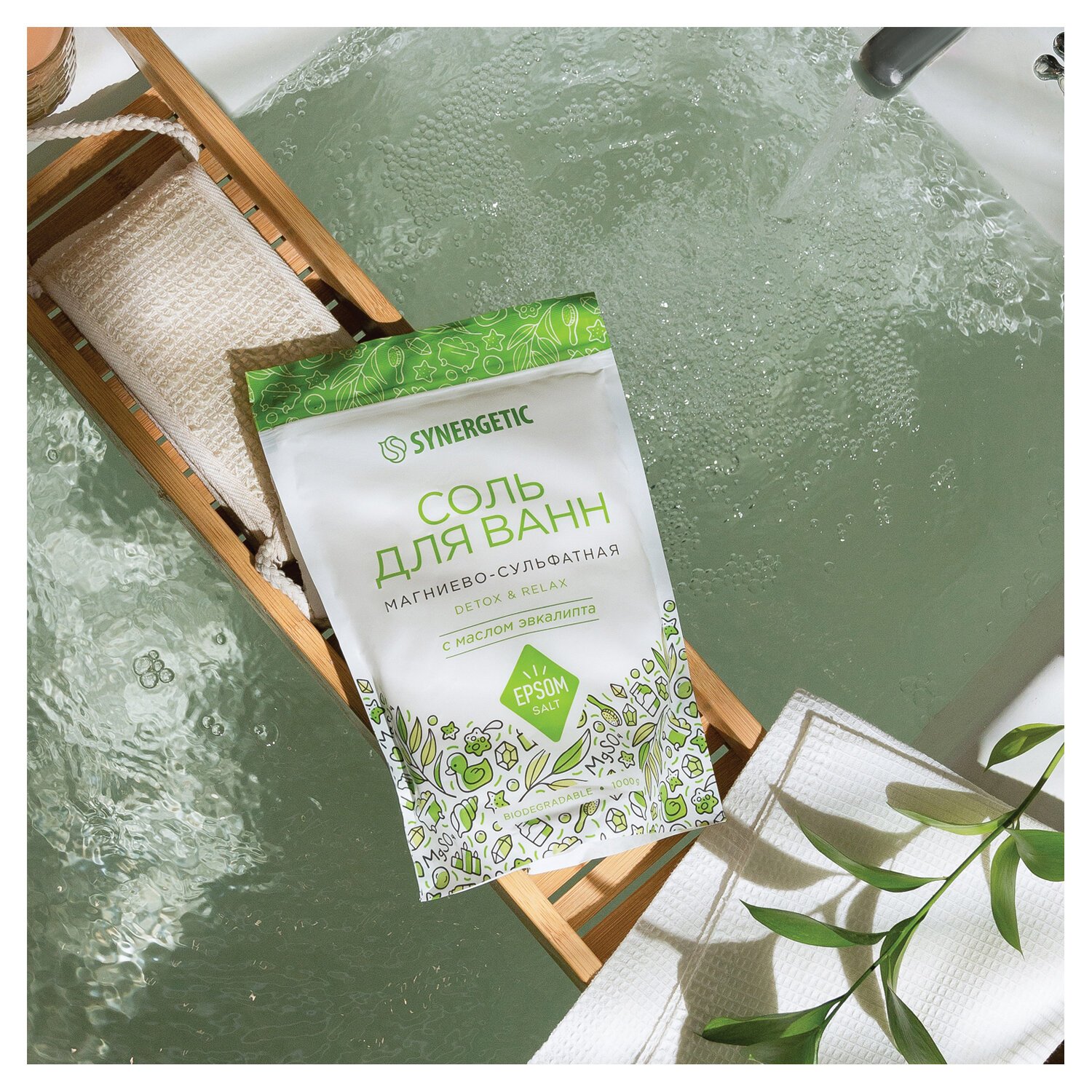 Соль для ванн 1 кг SYNERGETIC "Детокс и расслабление", магниево-сульфатная с эвкалиптом, 300013