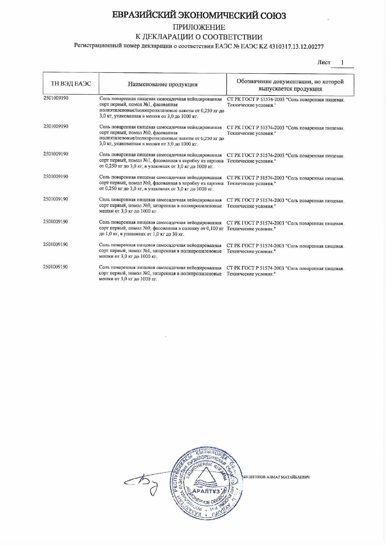 Состав: соль, йодат калия, содержание йода 40+/- 15мкг/г. Гранулометрический состав: до 0,8 мм включительно не менее 70%, свыше 1,2 мм не более 10%.