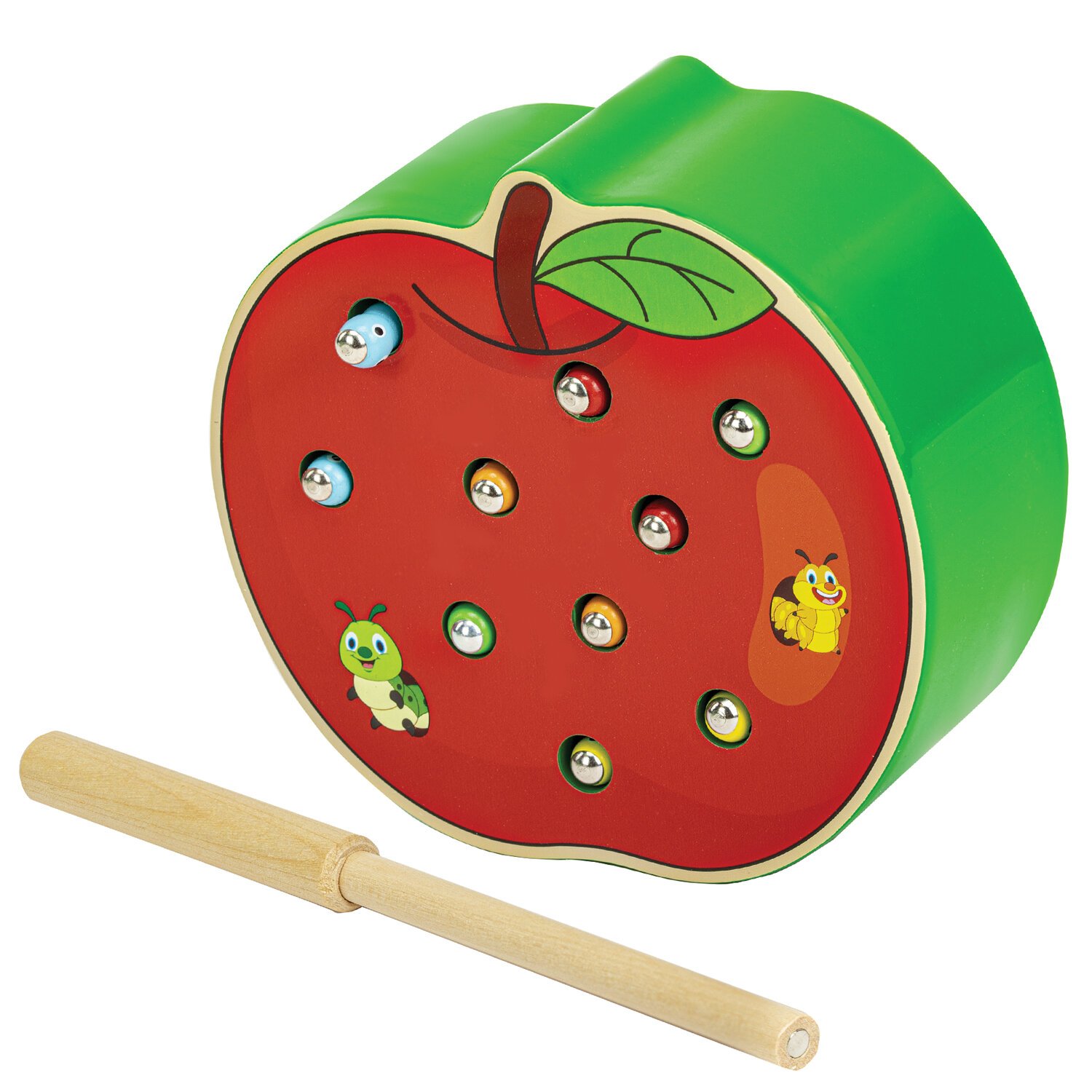 Яркое яблочко обязательно привлечет внимание ребенка и займет его надолго. Игра заключается в том, чтобы магнитной палочкой доставать червячков из основы. После этого малыш может рассортировать их обратно по лункам, развивая при этом аккуратность и навык вложения. С помощью гусениц ребенок будет изучать основные цвета и счет до десяти.