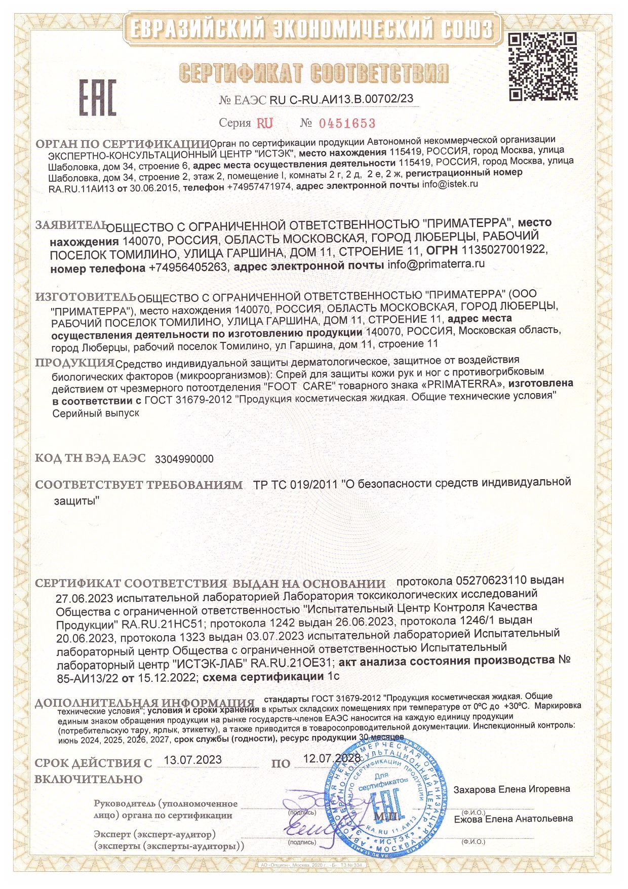 Спрей для ног PRIMATERRA FOOT CARE предназначен для эффективной защиты кожи от чрезмерного потоотделения.
