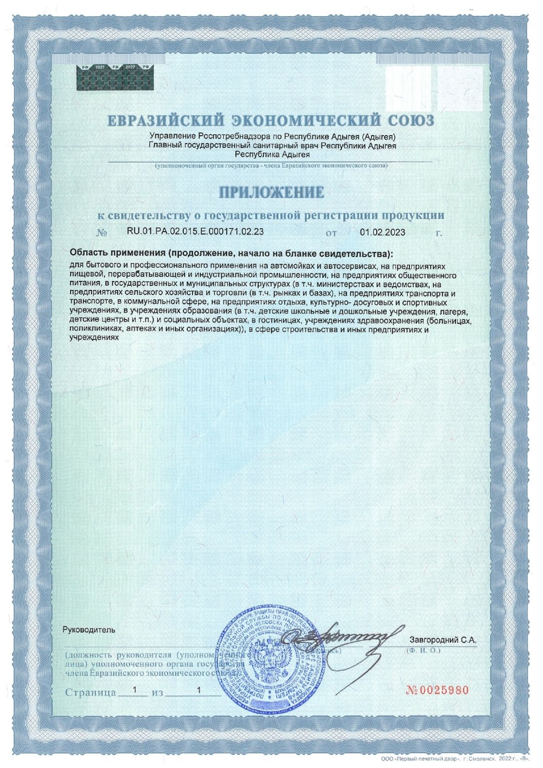 Эффективно удаляет различные загрязнения с водостойких поверхностей: линолеума, полимерных покрытий, керамической плитки, ламината, паркета, дерева, нержавеющей стали, стеклянных поверхностей, а также изделий из ткани и кожи, не повреждая волокон тканей. Эффективное средство для регулярной уборки, подходит и для сильно загрязненных поверхностей. Не оставляет разводов. Устраняет неприятные запахи.