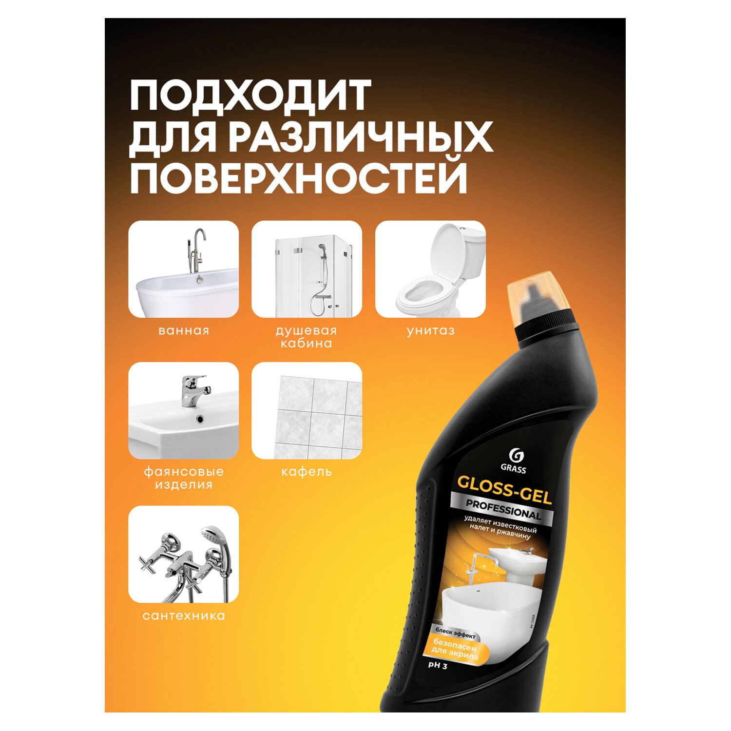 Используется для чистки ванн, душевых кабин, унитазов, водостоков, напольных покрытий, сантехники, фаянсовых изделий и кафеля от известкового налета, водного камня, потеков ржавчины, мыльных разводов и солевых отложений.