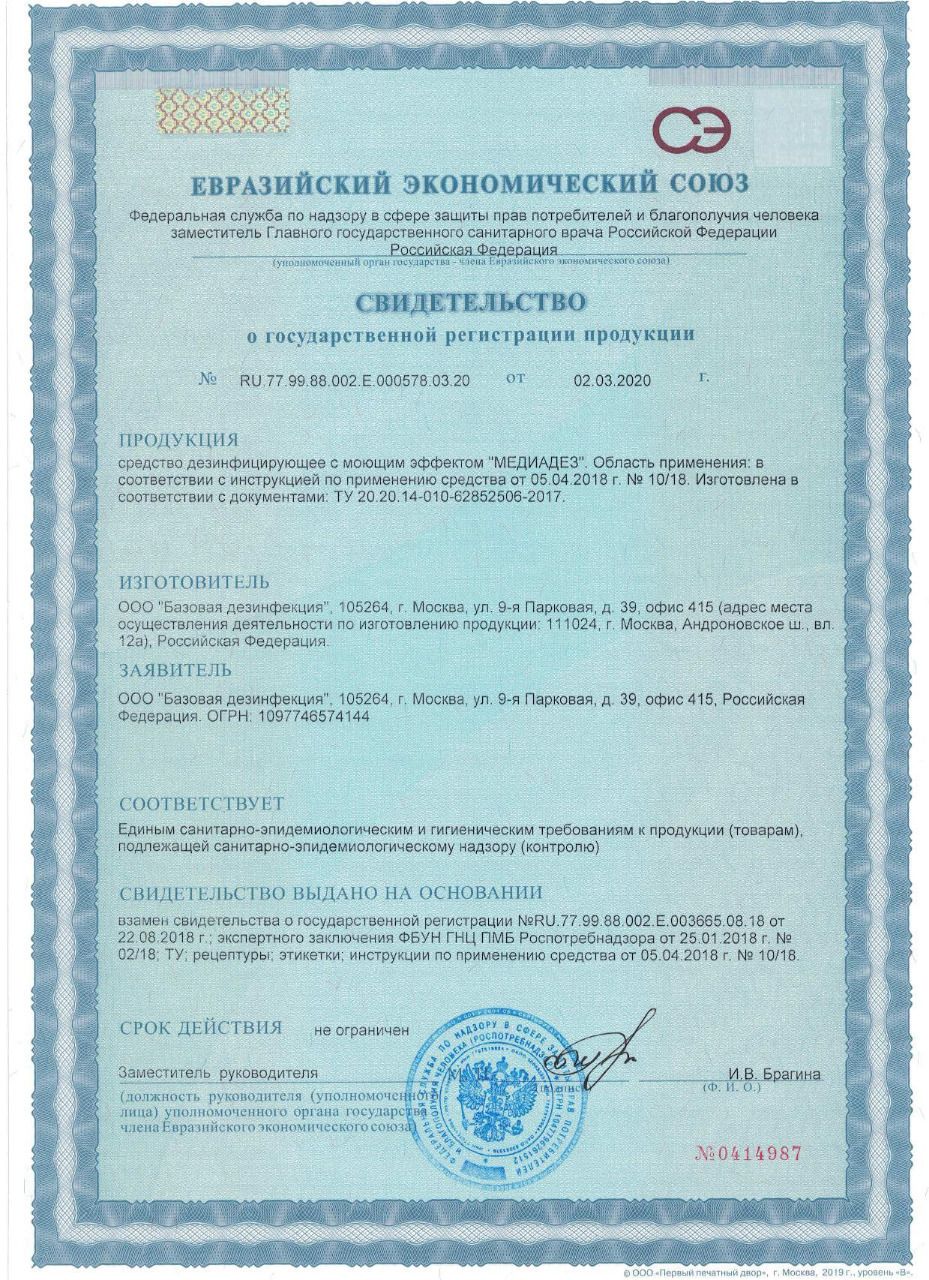 Дезинфицирующее средство МЕДИАДЕЗ на основе композиции "амин + ЧАС + гуанидин" с моющим и дезодорирующим эффектами.