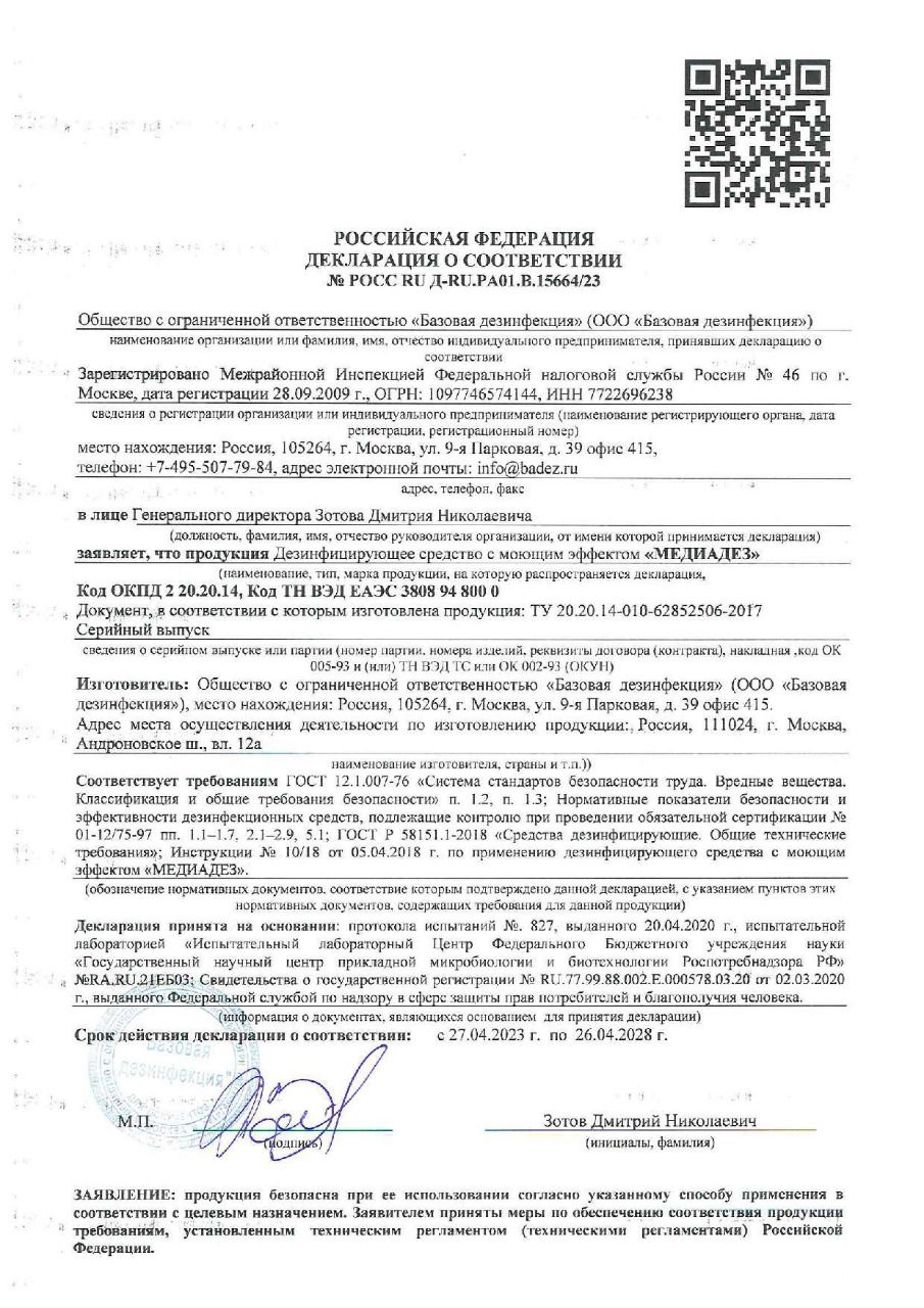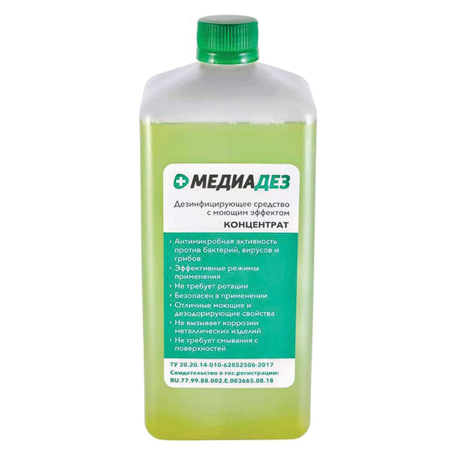 Дезинфицирующее средство с моющим эффектом «МЕДИАДЕЗ» представляет собой прозрачную жидкость без механических примесей от желто-зеленого до зеленого цвета со слабым специфическим запахом или запахом применяемой отдушки; допускается наличие незначительного осадка.