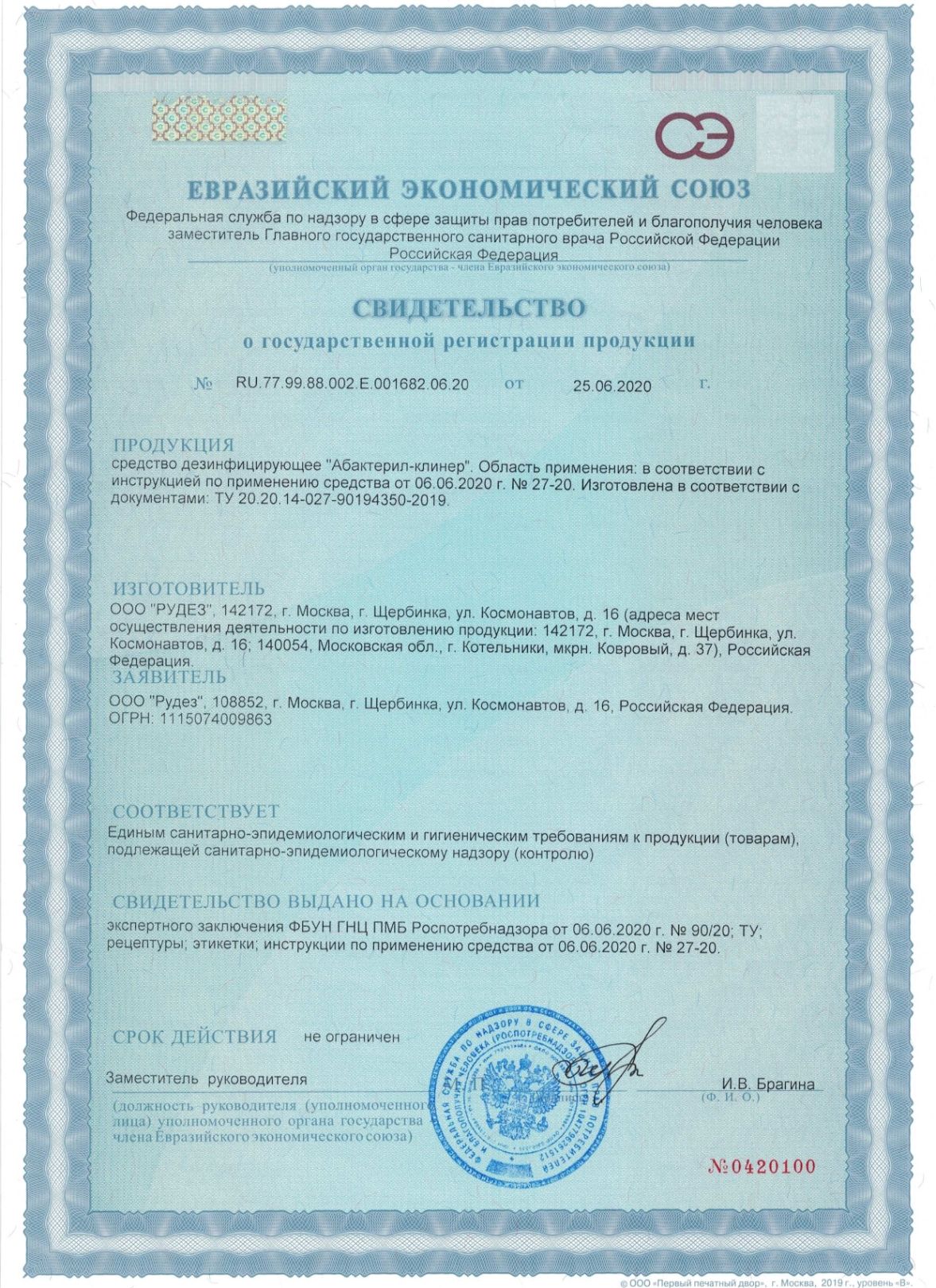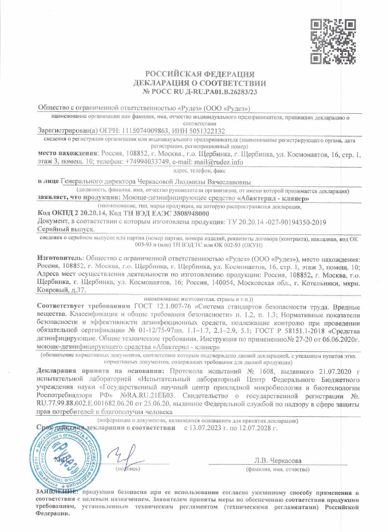 Универсальное средство АБАКТЕРИЛ-КЛИНЕР для совмещения в одном процессе дезинфекции и мытья различных поверхностей и объектов. Концентрат.