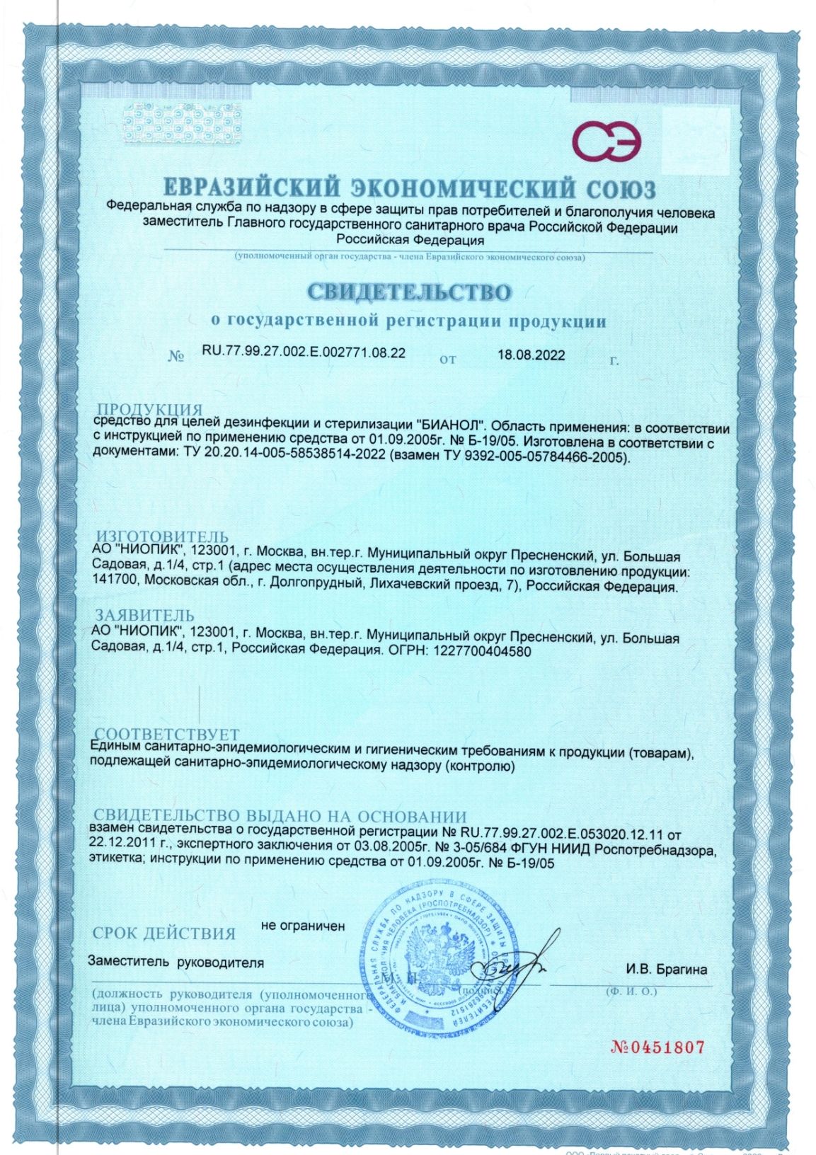 Средство БИАНОЛ (концентрат) для дезинфекции, включая дезинфекцию высокого уровня, и стерилизации.
