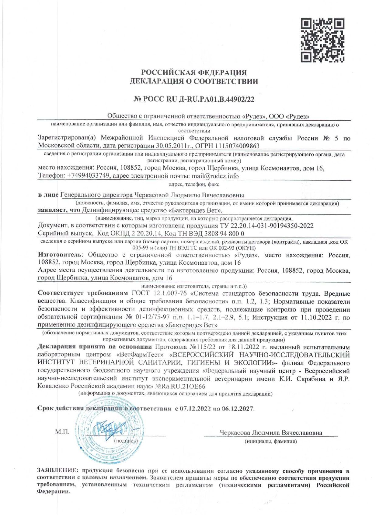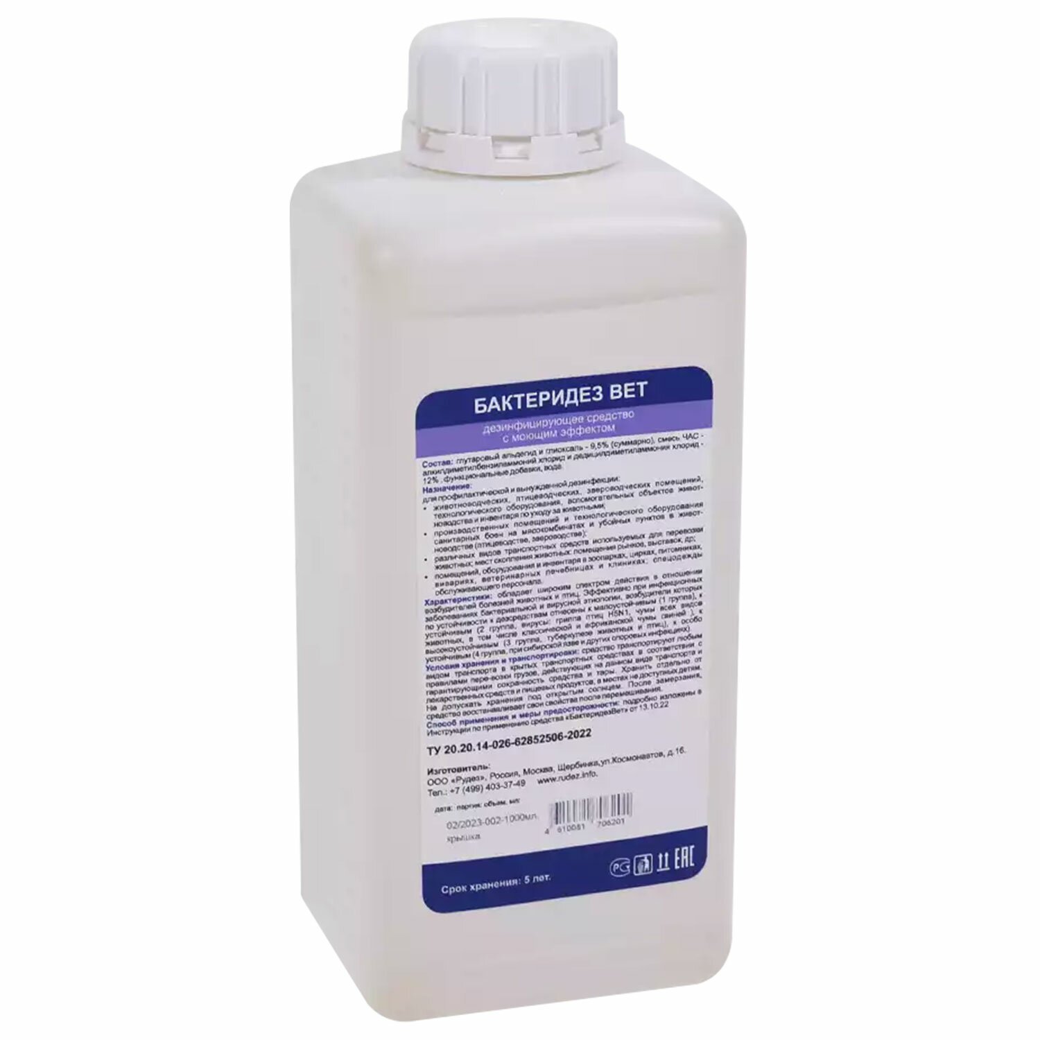 Дезинфицирующее средство с моющим эффектом БАКТЕРИДЕЗ ВЕТ для обработки объектов ветеринарного надзора и профилактики инфекционных болезней животных. Концентрат.