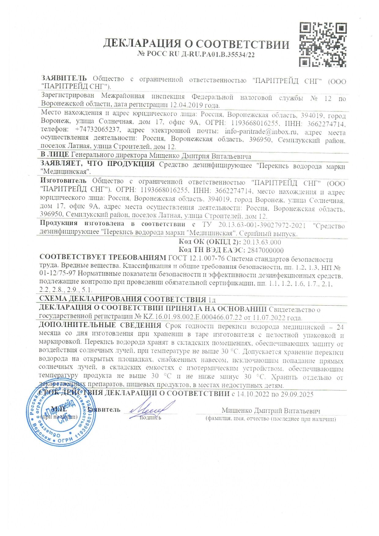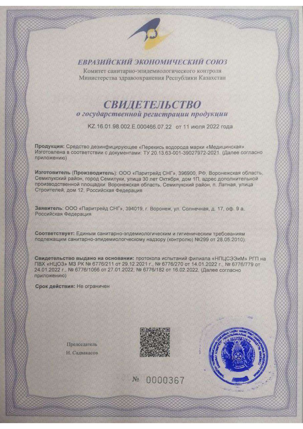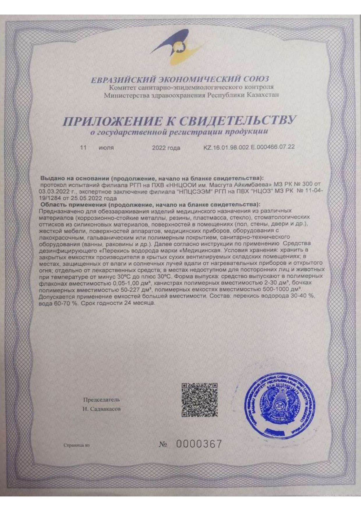 Представляет собой прозрачную бесцветную жидкость с содержанием перекиси водорода (ПВ) 30-40% в качестве действующего вещества. Срок годности перекиси водорода в невскрытой упаковке изготовителя при соблюдении условий хранения составляет 24 месяца; срок годности рабочих растворов - 24 часа.