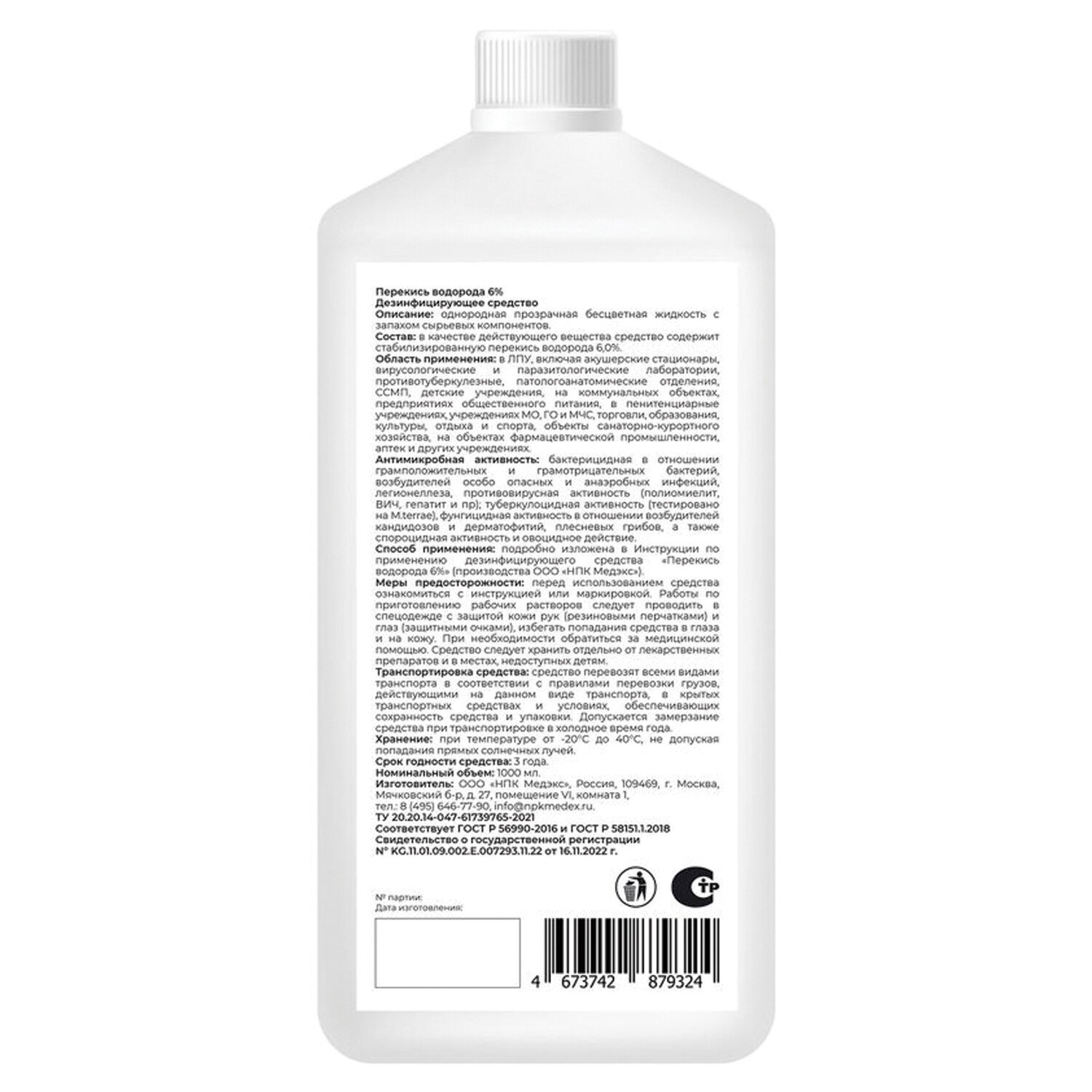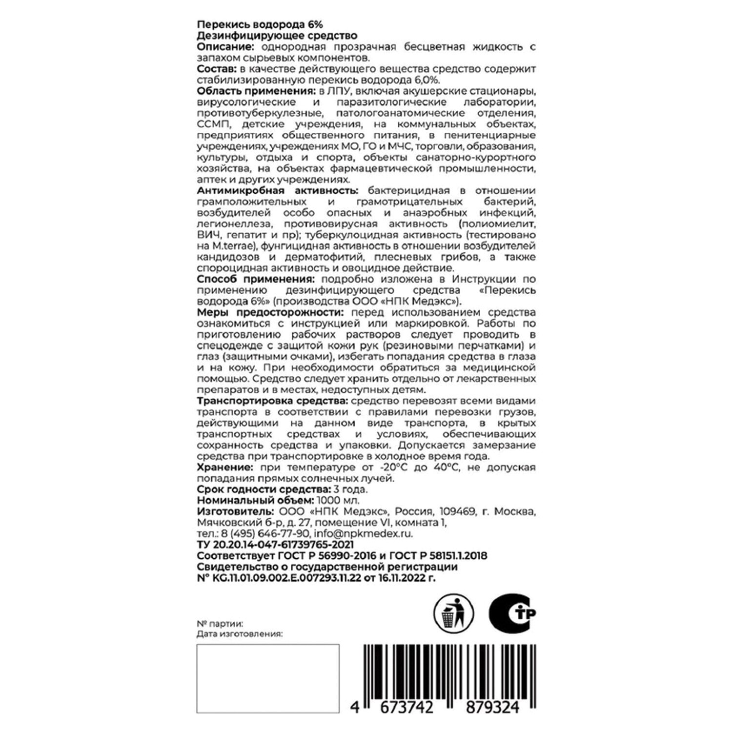 Жидкое концентрированное средство на основе перекиси водорода 6% предназначенное для дезинфекции твердых непористых поверхностей, приборов и оборудования, обеззараживания воздуха, белья, игрушек изделий медицинского назначения (ИМН), дезинфекции высокого уровня (ДВУ) эндоскопов (жестких и гибких), стерилизации ИМН, жесткие и гибкие эндоскопы и инструменты к ним.