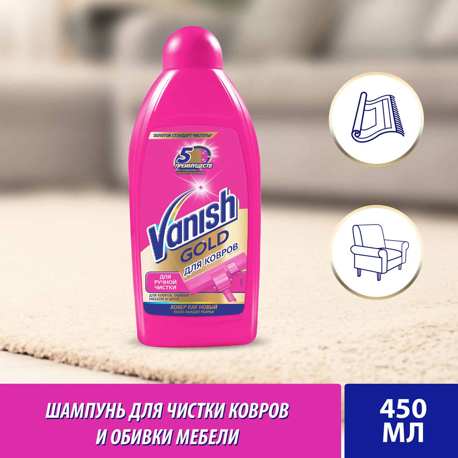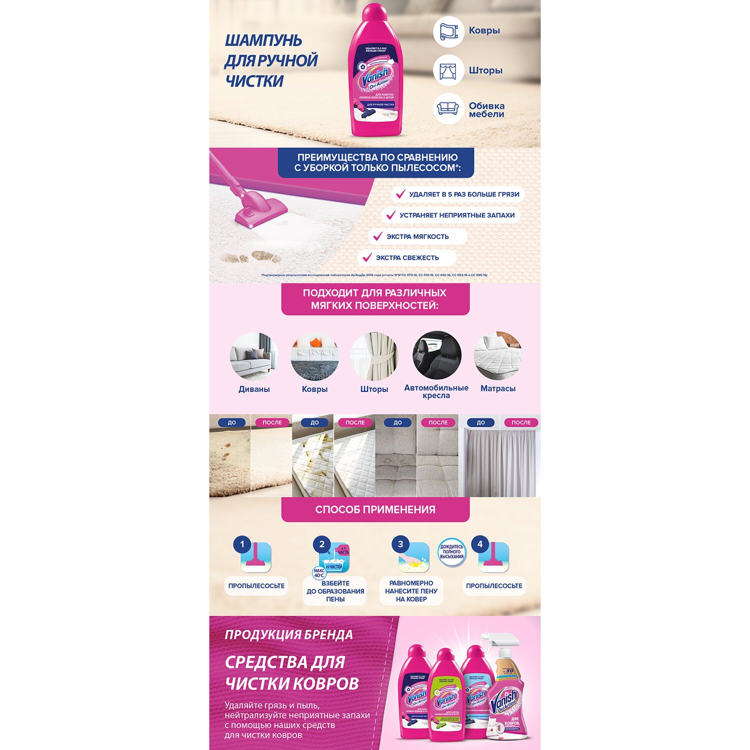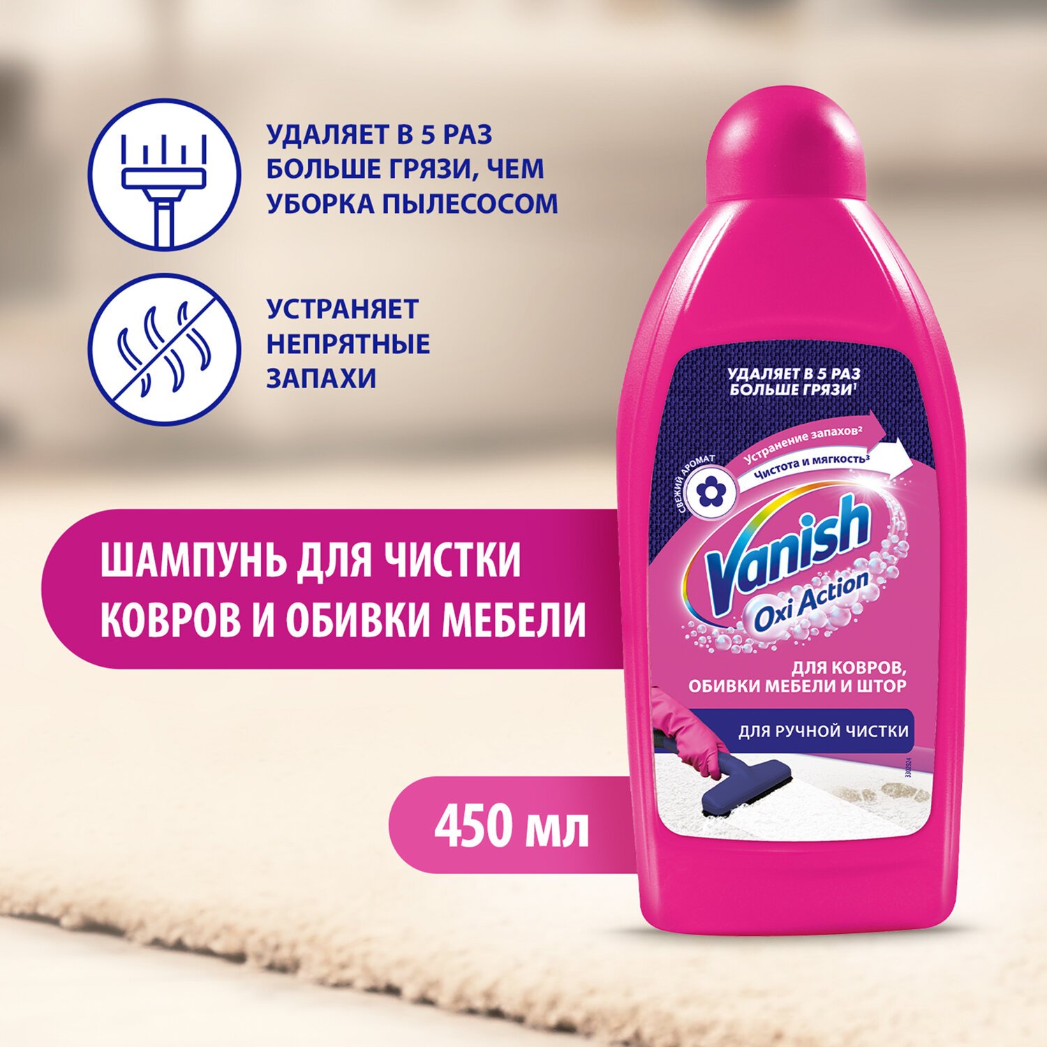 Используйте шампунь VANISH "3 в 1" для удаления въевшейся грязи и пыли с ковров и обивки. Густой шампунь образует обильную пену и устраняет неприятные запахи, а ваш ковер и обивка мебели сияют чистотой и свежестью – эффект значительно сильнее, чем при обычной уборке пылесосом. Доступен в форматах: 100 мл, 450 мл, 750 мл.