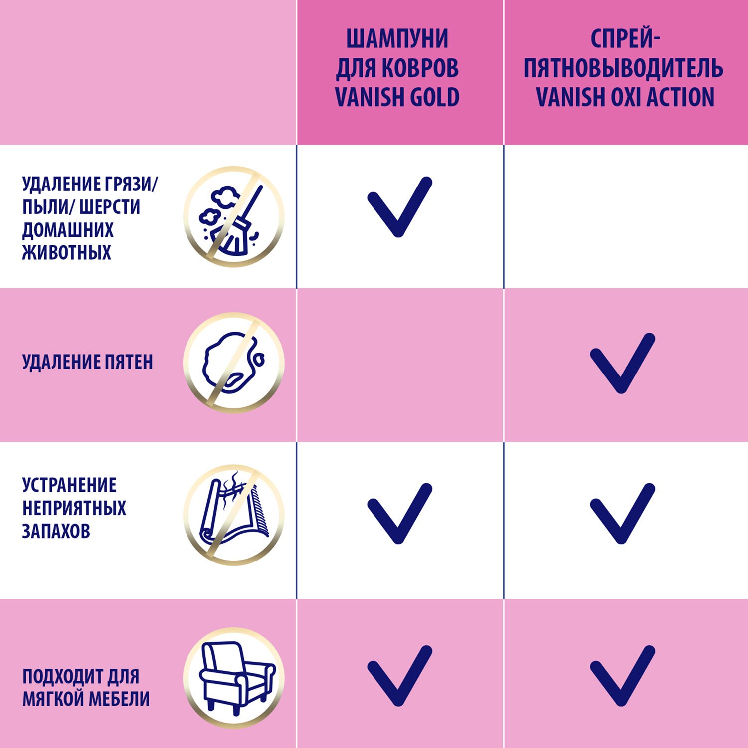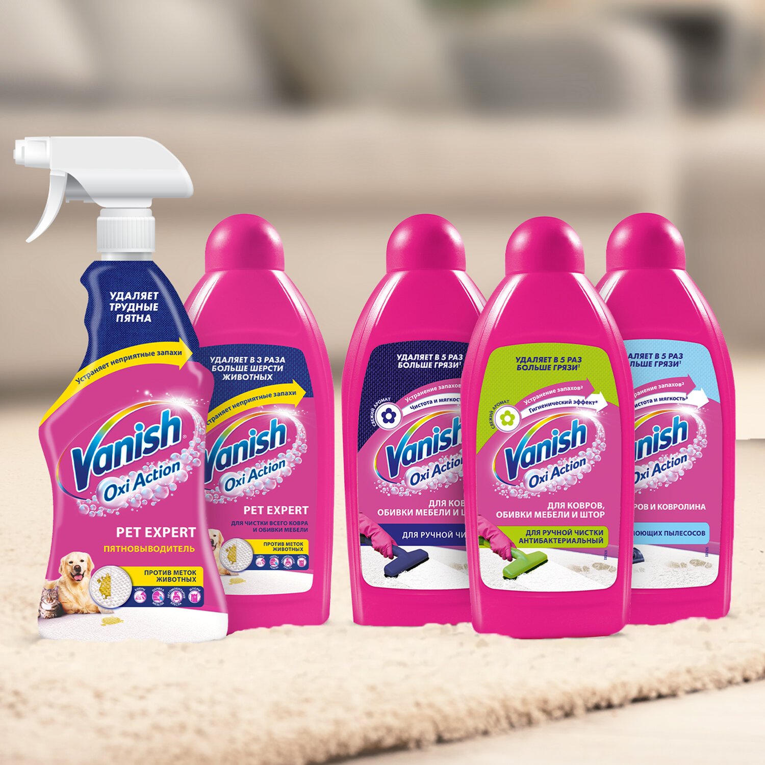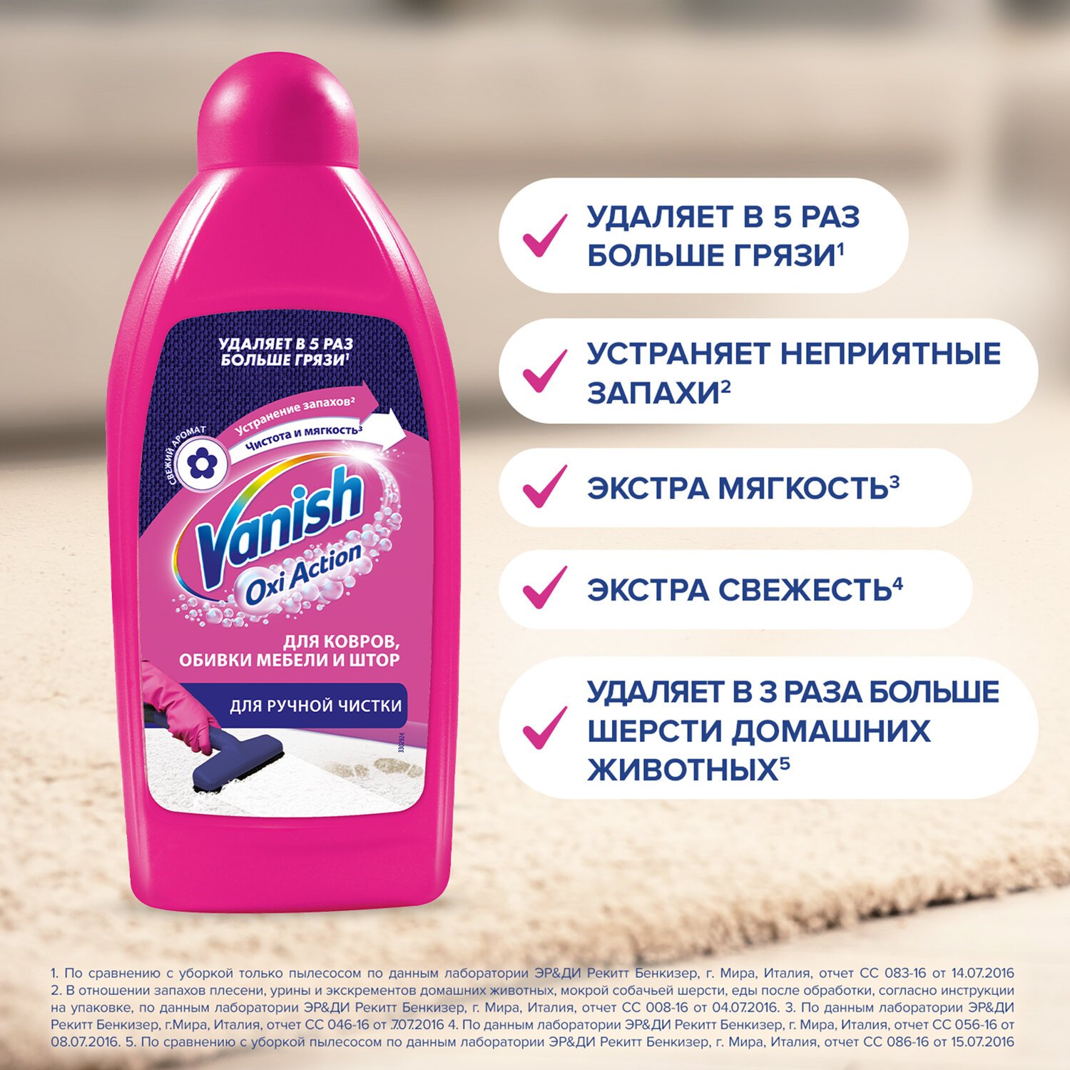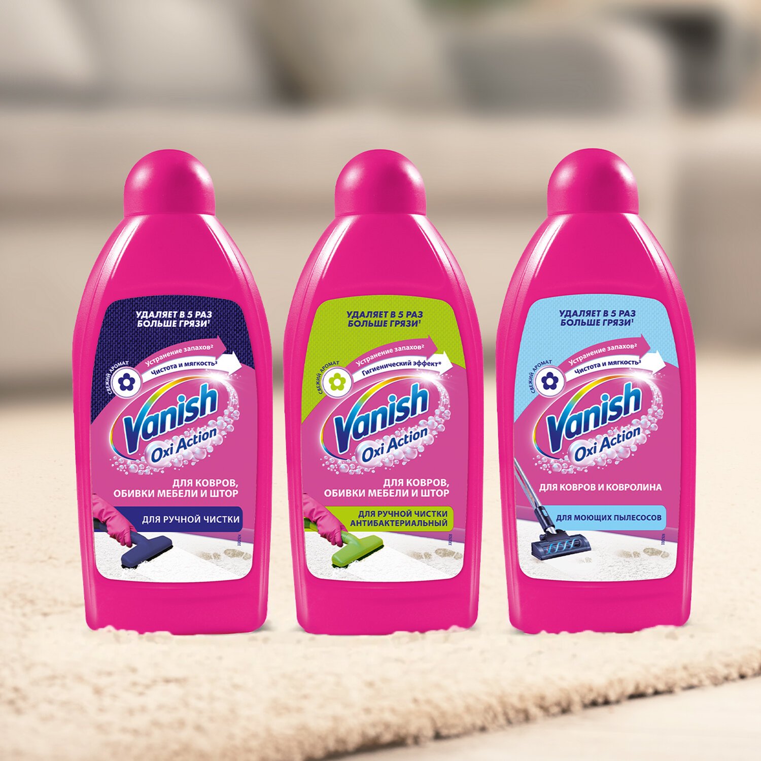 Используйте шампунь VANISH "3 в 1" для удаления въевшейся грязи и пыли с ковров и обивки. Густой шампунь образует обильную пену и устраняет неприятные запахи, а ваш ковер и обивка мебели сияют чистотой и свежестью – эффект значительно сильнее, чем при обычной уборке пылесосом. Доступен в форматах: 100 мл, 450 мл, 750 мл.