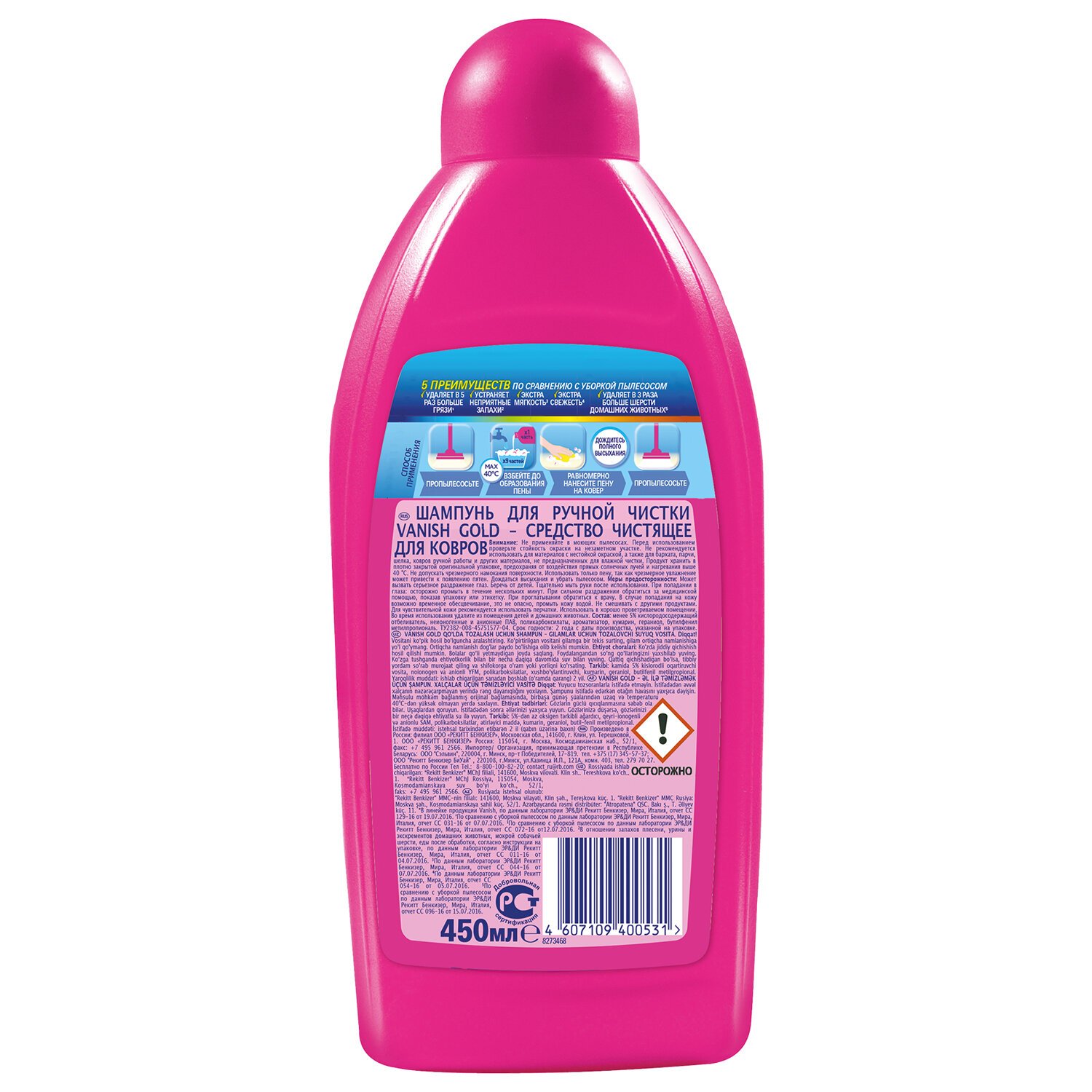 Шампунь VANISH "3 в 1" для ручной чистки ковров и обивки мебели. Шампунь глубоко проникает в волокна ковра, высвобождая частички грязи и выталкивая их на поверхность. Активный кислород в составе формулы позволяет удалить въевшиеся пятна.