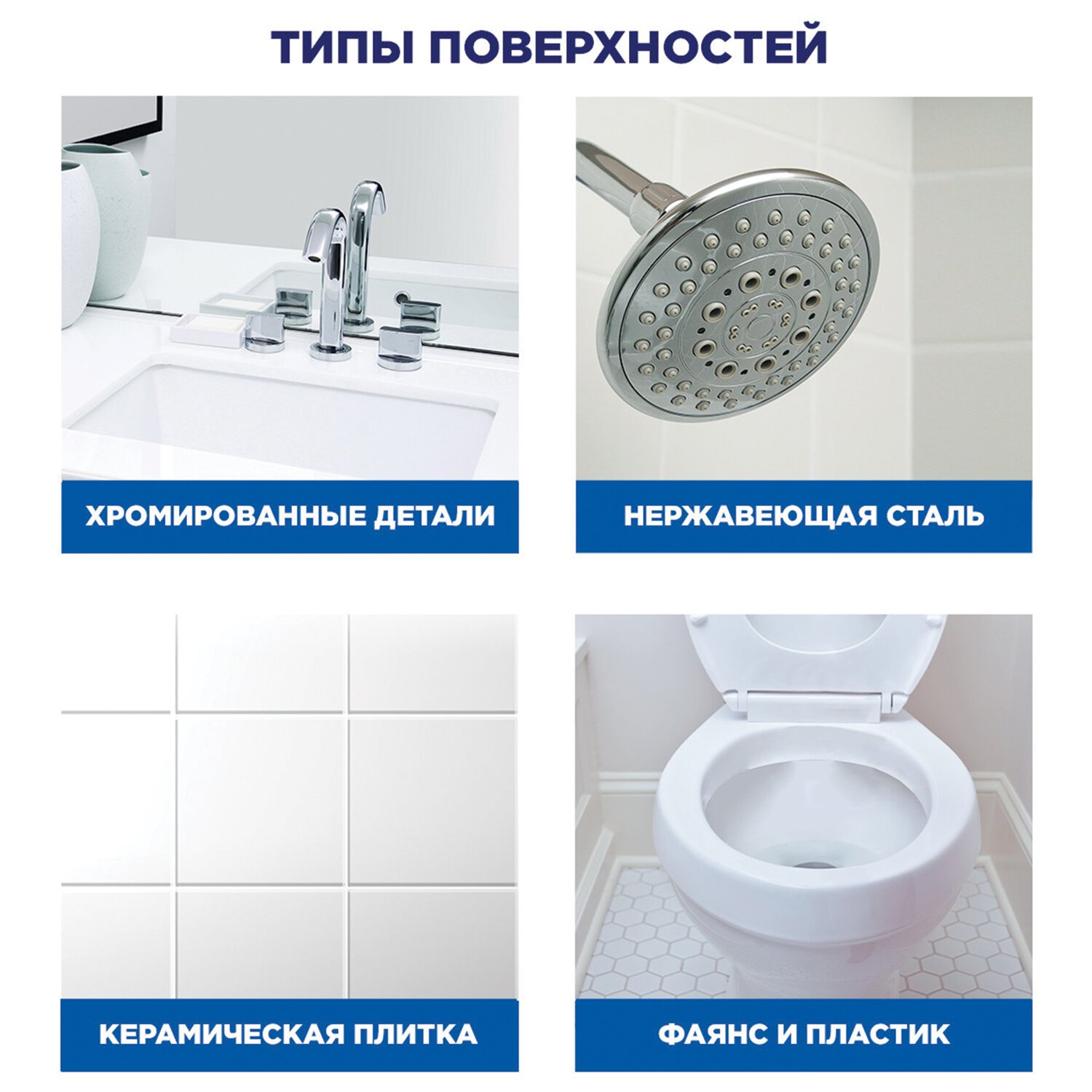 Средство специально создано для удаления самых сложных пятен в ванной. Быстро устраняет ржавчину, мыльные отложения и въевшуюся грязь. Устраняет 100% известкового налета. Возвращает поверхностям первоначальный блеск.