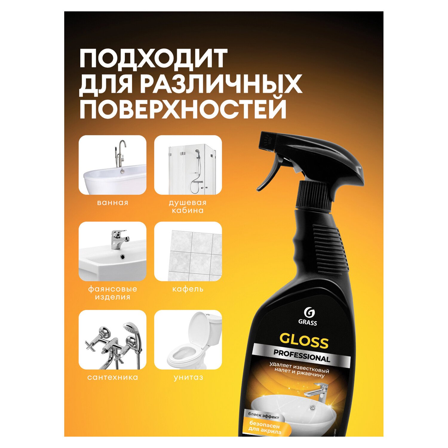 Средство GRASS GLOSS PROFESSIONAL используется для чистки ванн, душевых кабин, унитазов, водостоков, напольных покрытий, сантехники, фаянсовых изделий и кафеля от известкового налета, водного камня, потеков ржавчины, мыльных разводов и солевых отложений.