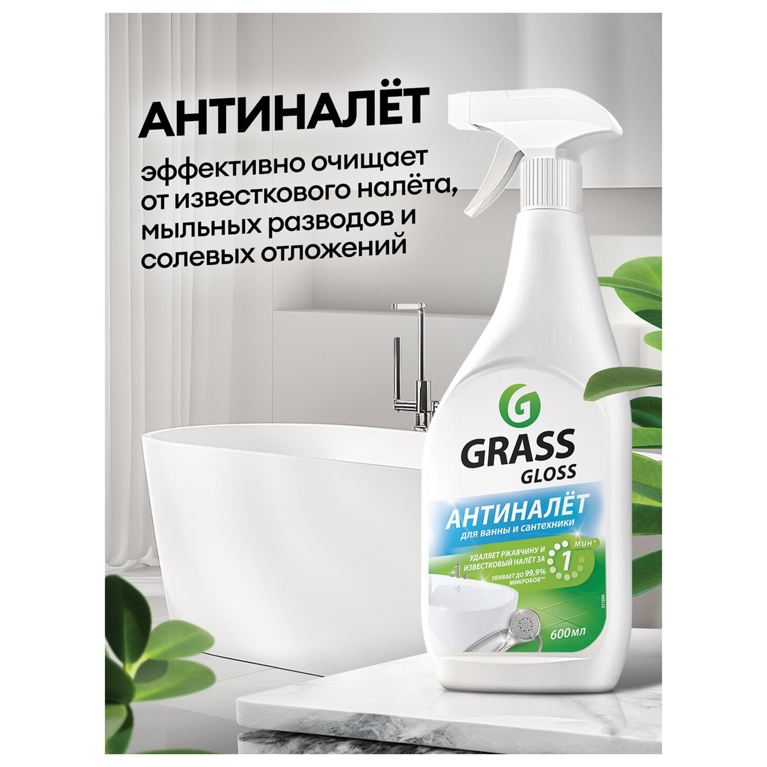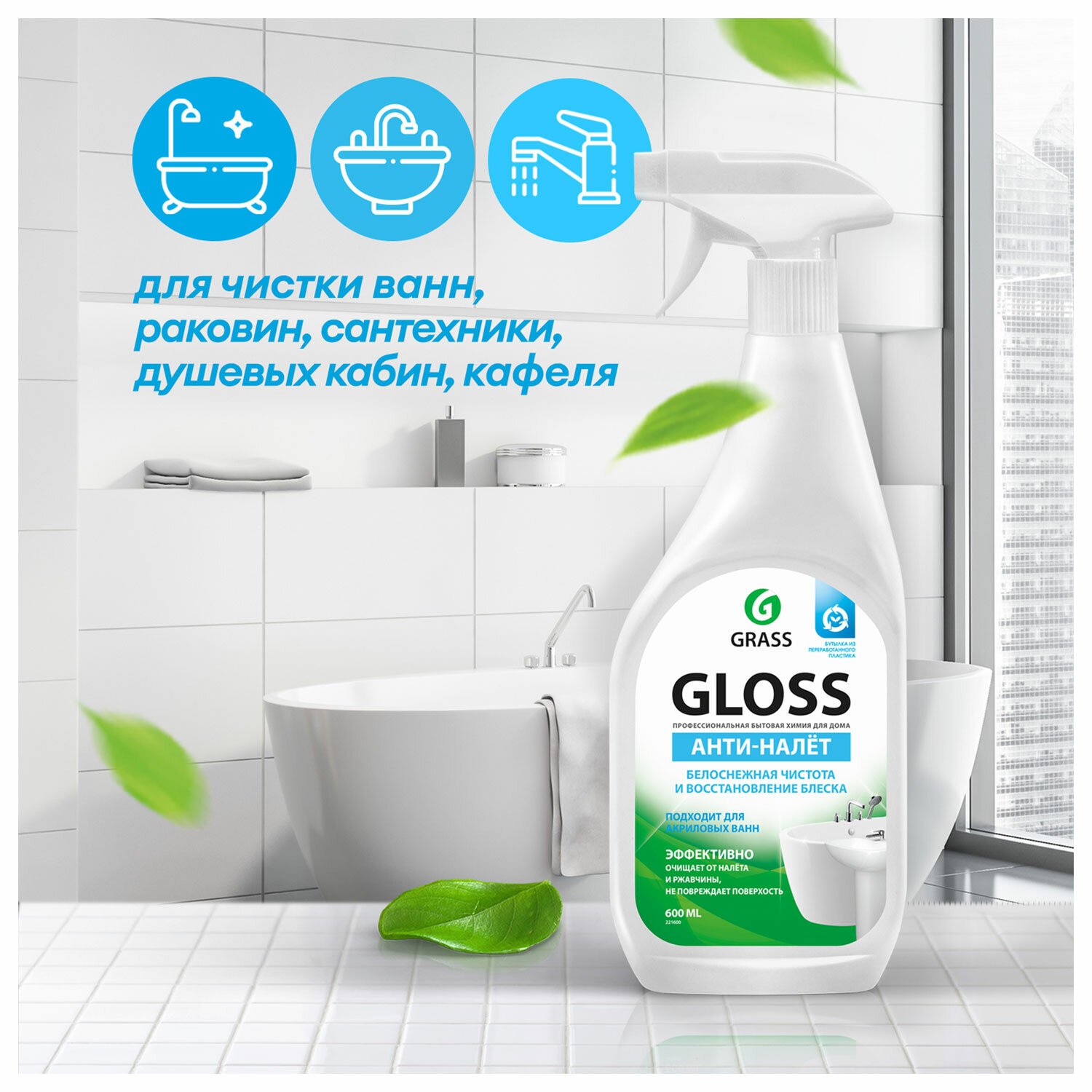 GRASS GLOSS – универсальное моющее средство на основе лимонной кислоты. Подходит для чистки ванны, душевой кабины, сантехники, фаянсовых изделий и кафеля от известкового налета, потеков ржавчины, мыльных разводов и солевых отложений.
