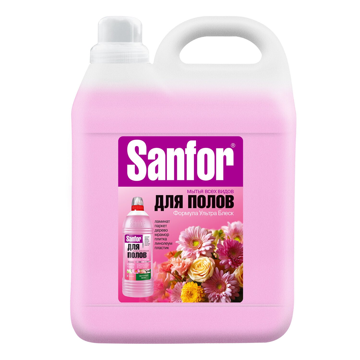 Средство для мытья пола SANFOR "Цветочный фреш" обладает высоким уровнем чистящей способности и придает блеск обработанным поверхностям, создавая эффект защитной плёнки.