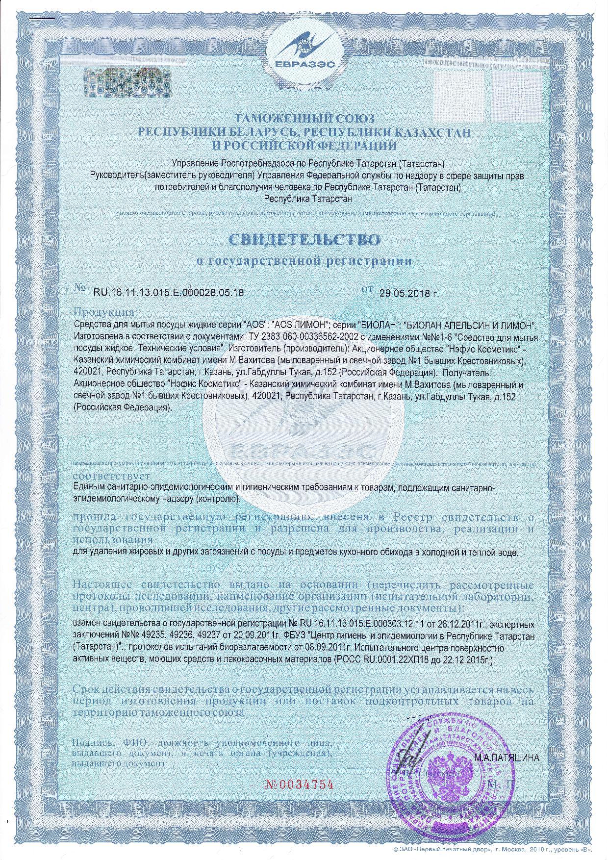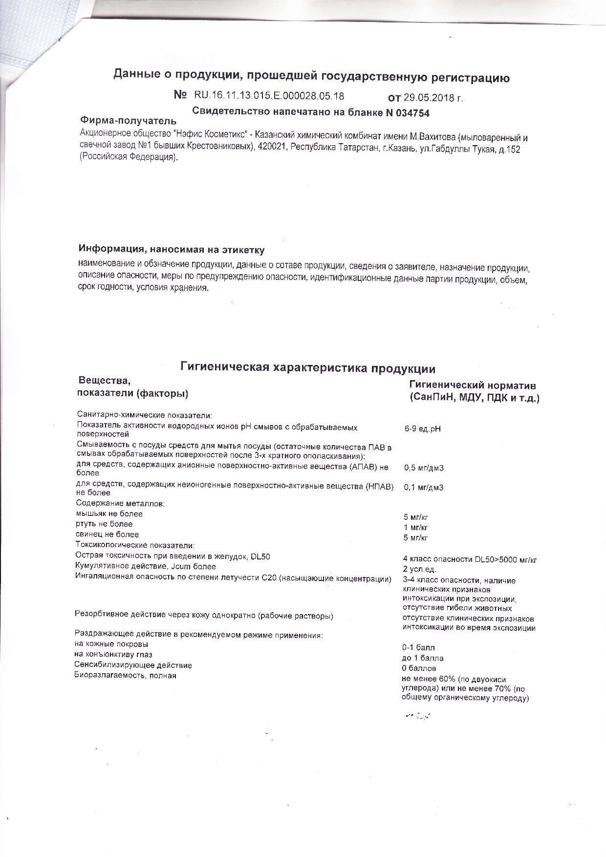 Состав: 5-15% анионные ПАВ, не более 5% неионогенные ПАВ, амфотерные ПАВ, соль этилендиаминтетрауксусной кислоты, ароматизирующая добавка, красители, экстракт лимона, регулятор рН, консервант.