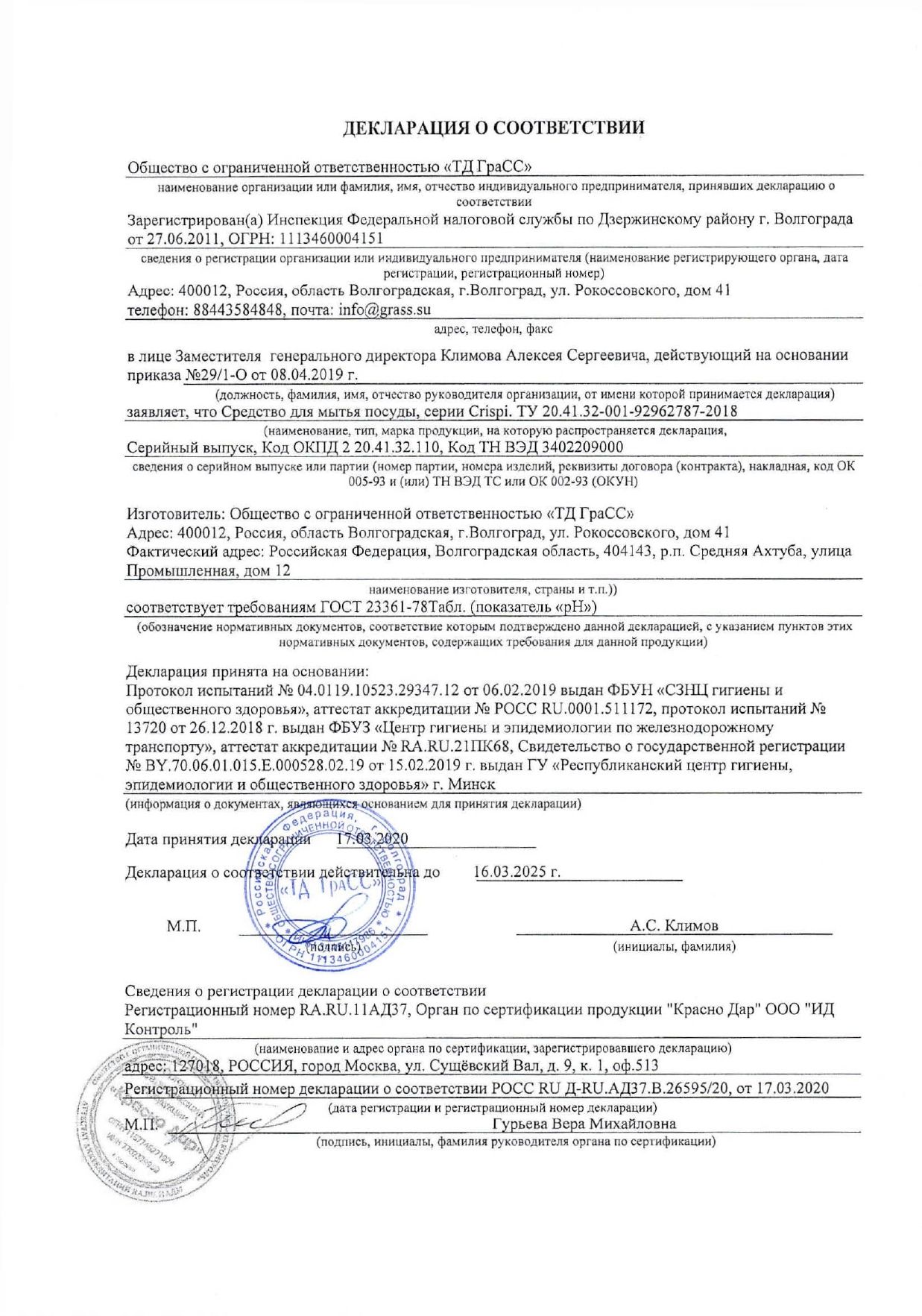 Концентрированный состав средства CRISPI by GRASS эффективно удаляет жир как в горячей, так и в холодной воде. Полностью смывается водой. Не вызывает сухость и раздражение кожи.