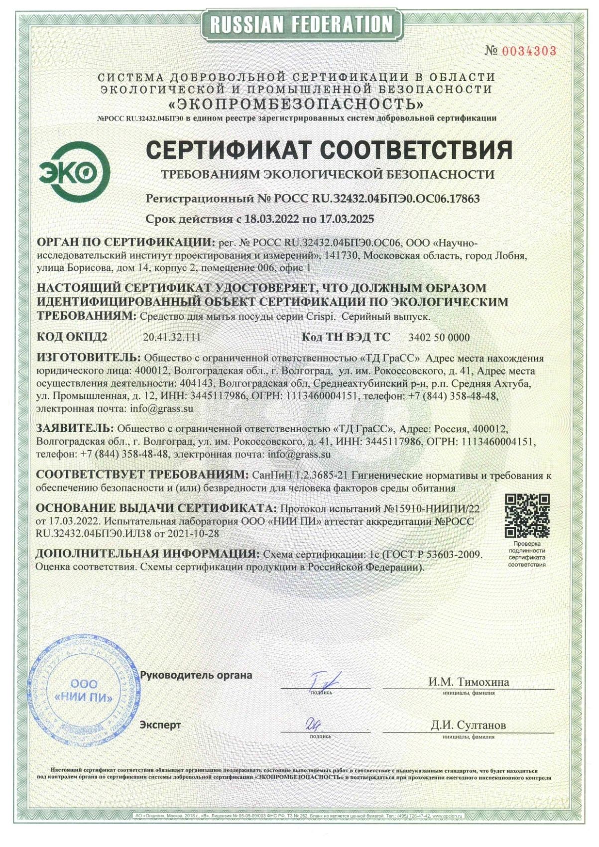 Средство для мытья посуды, детской посуды, игрушек ЭКО 750 мл CRISPI by GRASS, 125721