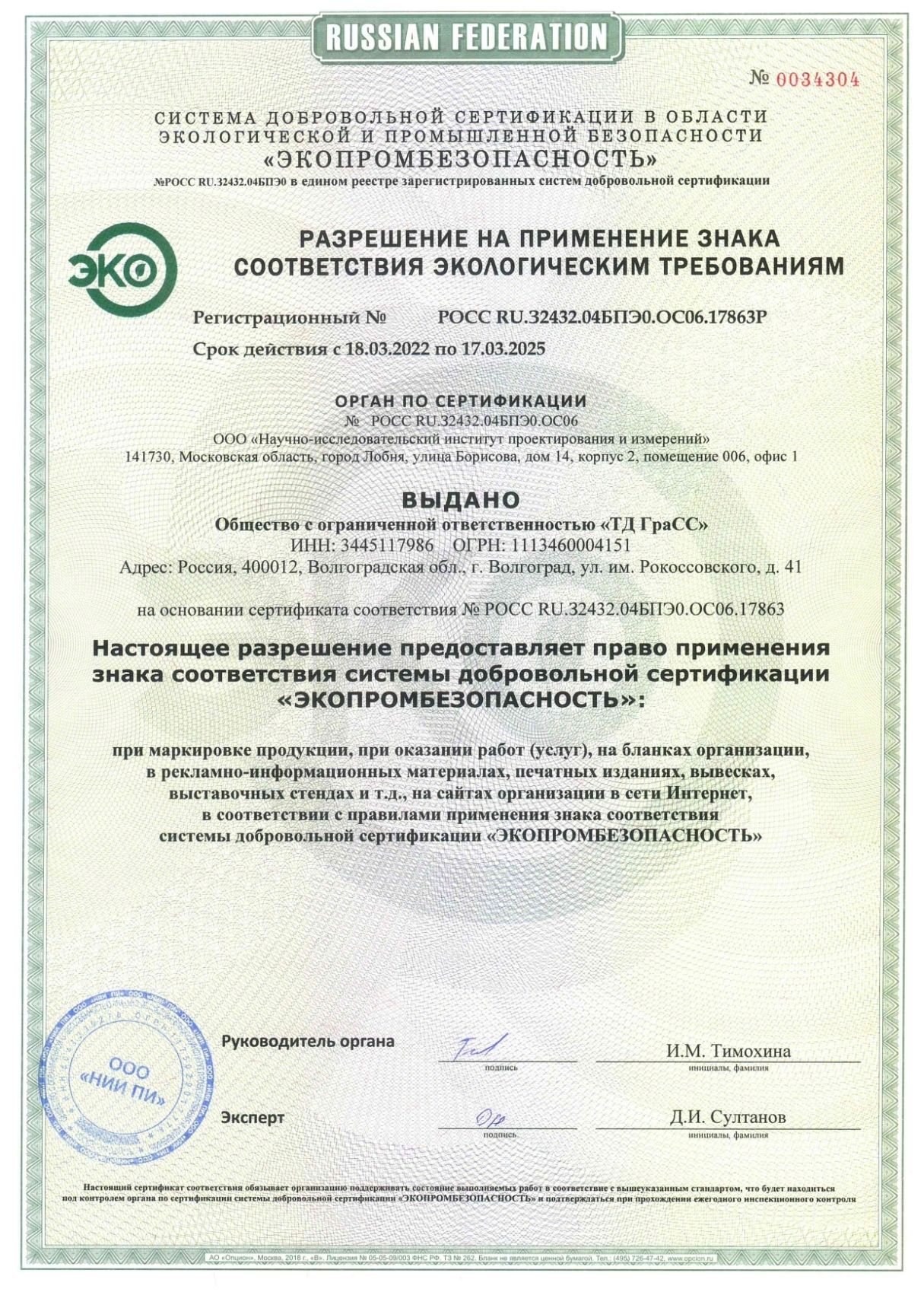 Данный продукт имеет экологический сертификат "Листок жизни". "Листок жизни" – единственная в России экомаркировка, признанная на международном уровне. Продукт прошел строгую экологическую проверку по всему жизненному циклу: от добычи сырья до утилизации упаковки. Оценку проводит аккредитованный орган по сертификации "Экологический союз", который работает в соответствии со стандартом ISO 17065.