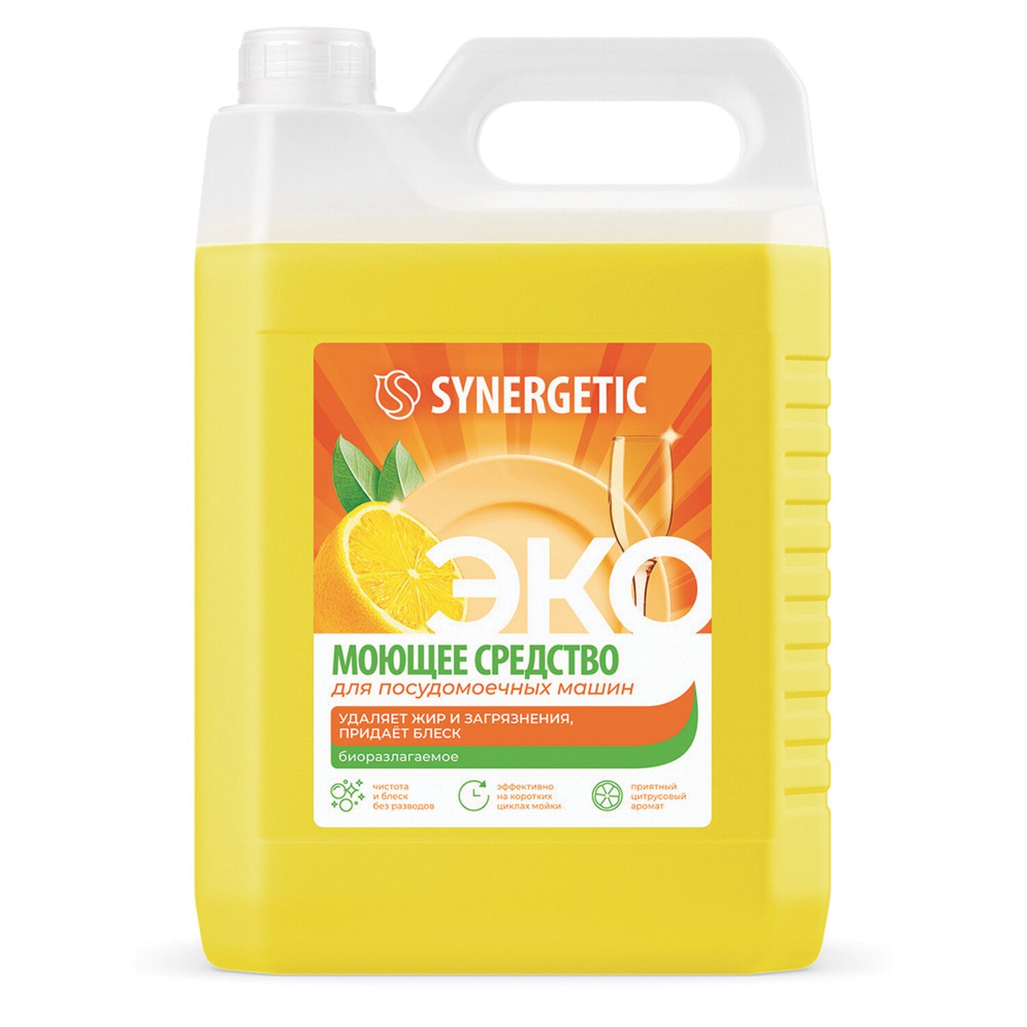 Биоразлагаемое концентрированное средство для посудомоечных машин SYNERGETIC – универсальное средство для мытья посуды, столовых приборов и кухонного инвентаря в посудомоечных машинах любого типа. Оно эффективно даже на коротких циклах мойки. Средство полностью смывается водой и подходит для мытья детской посуды. Комплекс растительных Н-тензидов и соды удаляет сложные загрязнения, растворяет жир, качественно и бережно очищает посуду и столовые приборы. Специальные добавки защищают машину от накипи, предотвращают повторное оседание загрязнений, придают блеск, не оставляют разводов и известкового налета на поверхности посуды. Гипоаллергенная парфюмерная композиция на основе натуральных эфирных масел лимона, лемонграсса и лайма придает средству приятный цитрусовый аромат. Пищевой краситель в низких концентрациях придает гелю нежно-желтый цвет. Биоразлагаемые компоненты не вредят микрофлоре септических установок. Попадая в среду септика, средство без труда распадается на простые соединения.