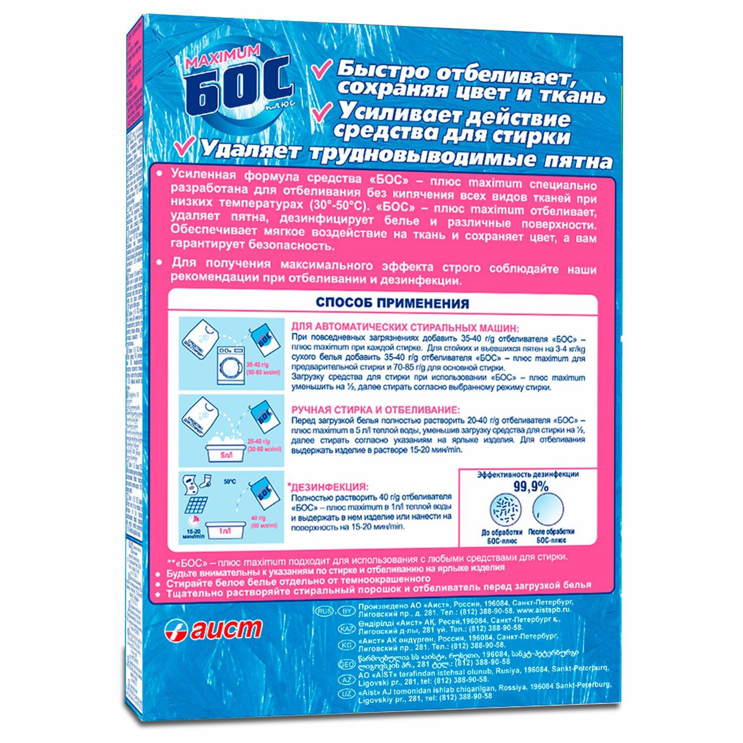 Усиленная формула средства БОС плюс "Maximum" с максимальным содержанием активного кислорода специально разработана для отбеливания без кипячения всех видов тканей, включая шерсть и шёлк, при низких температурах (30°-50ºС).