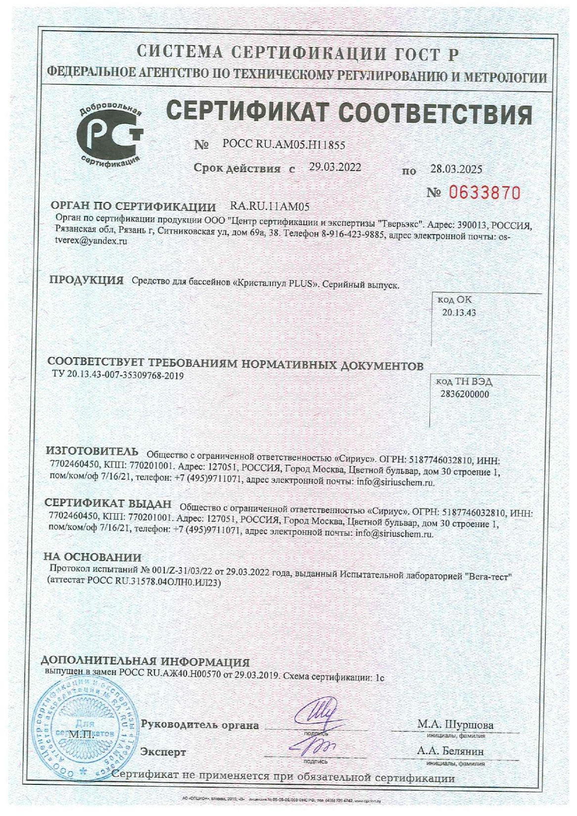 КРИСТАЛПУЛ PLUS не оказывает отрицательного воздействия на поверхности из цветного декоративного пластика (бумажнослоистого, стеклопластика), тисненых поверхностей из винилискожи, мрамора, деревянных поверхностей, резиновых и виниловых изделий, ворсового полотна. Не фиксирует органические загрязнения. Не вызывает коррозии металлов. Не наносит вреда системам циркуляции/фильтрации в том числе SPA. Разрешено применять в водоемах и бассейнах с кварцевым песком.