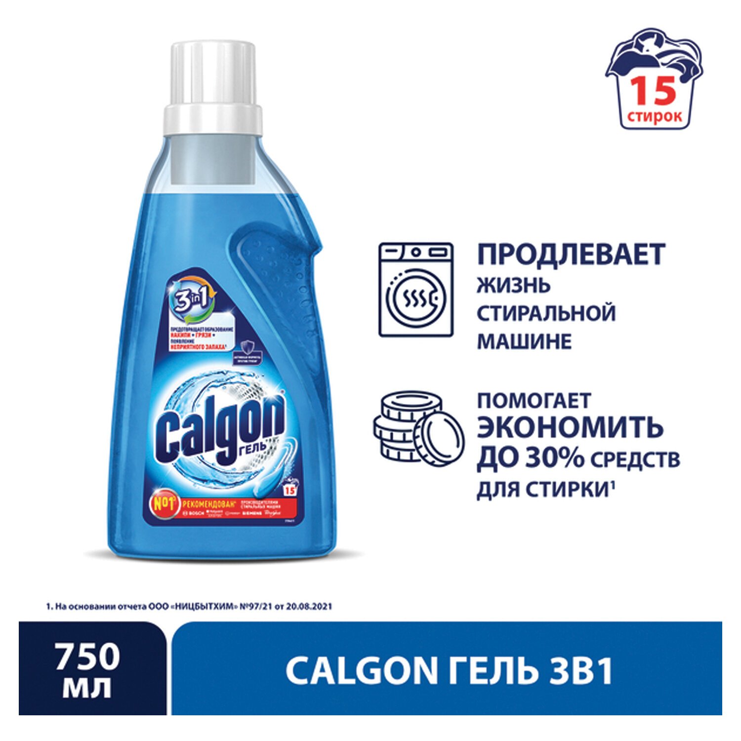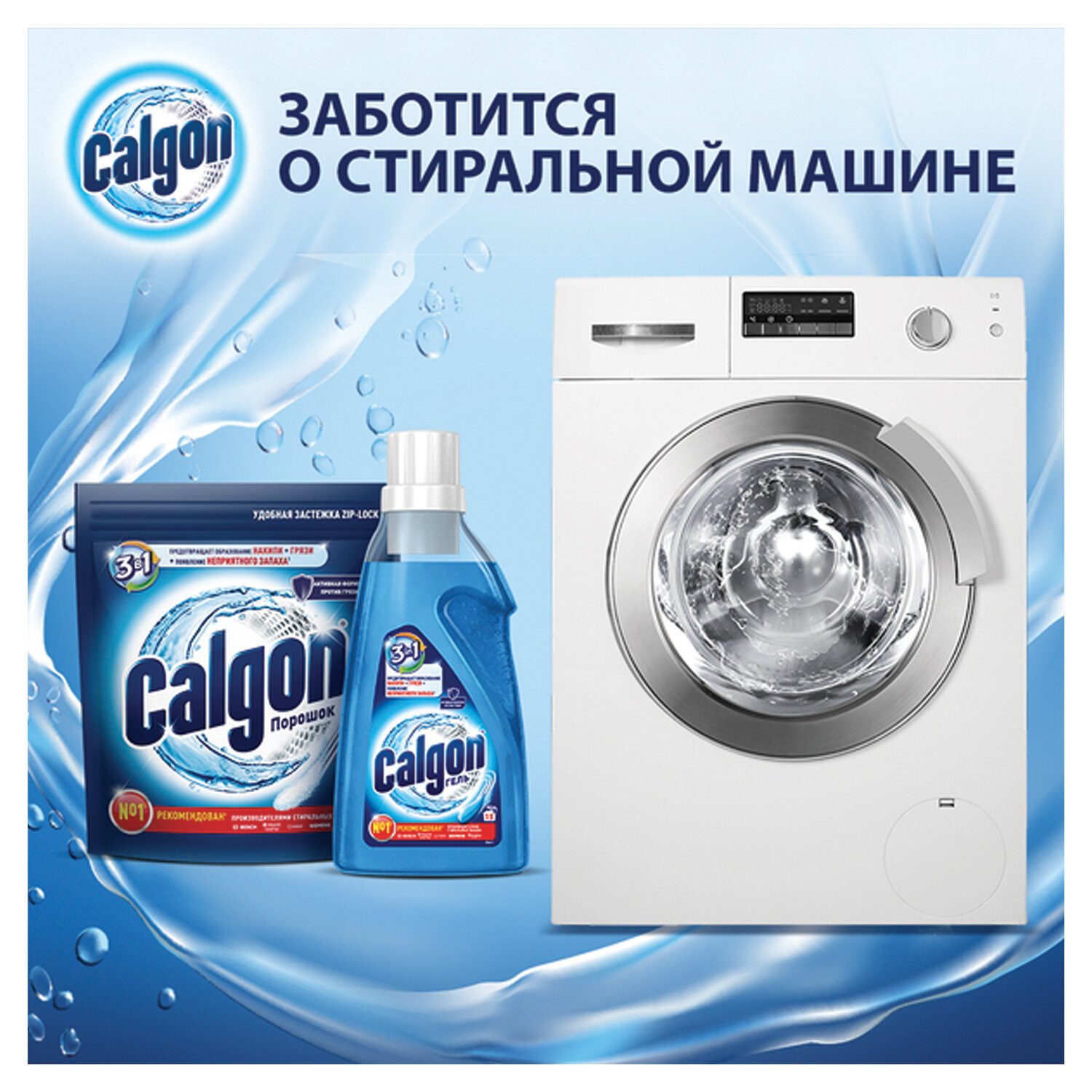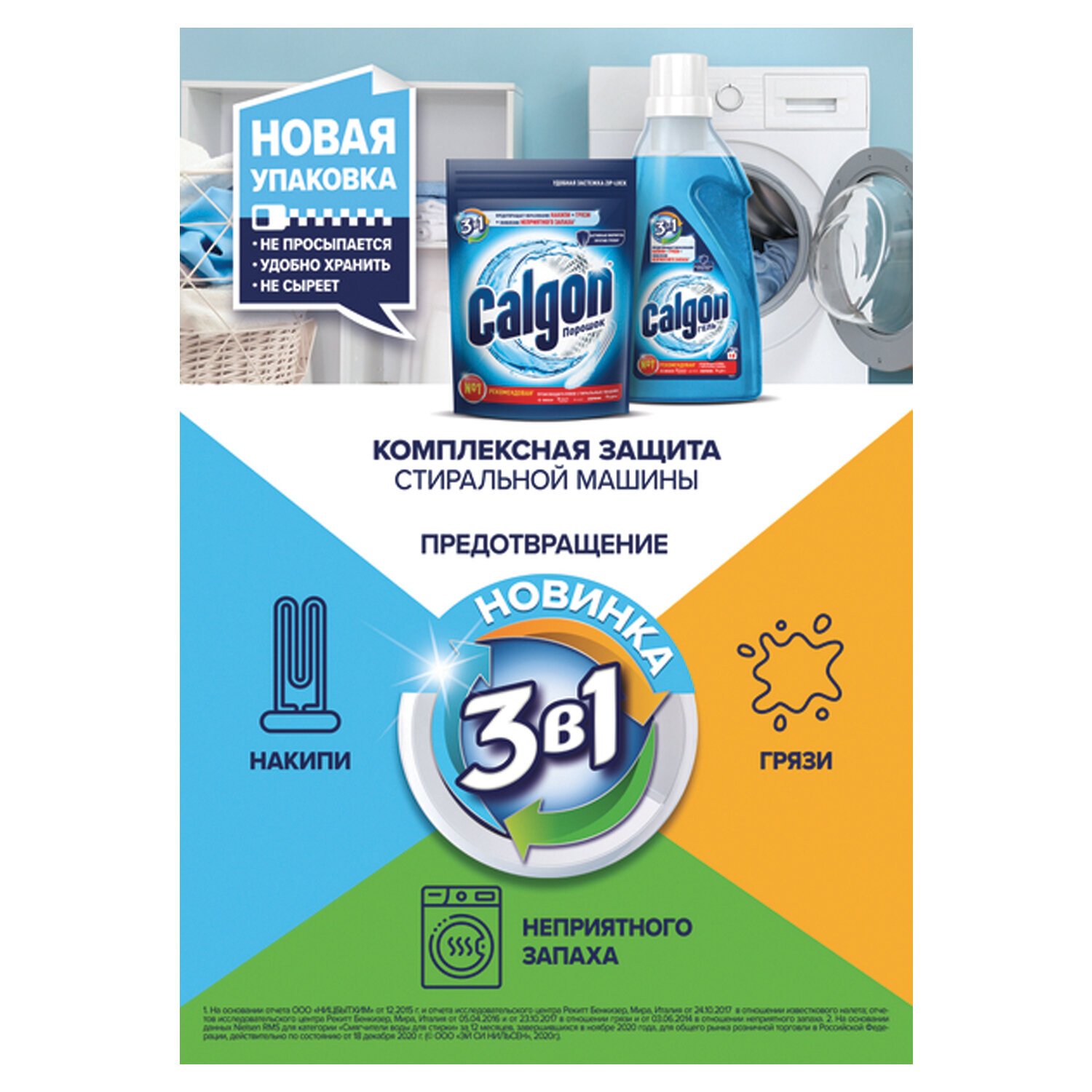 Calgon 3в1 для предотвращения образования накипи, грязи и появления неприятного запаха.