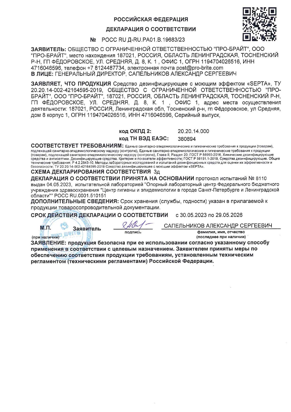 Способ применения: дезинфекцию и мойку объектов проводить способами протирания, орошения, погружения, замачивания.