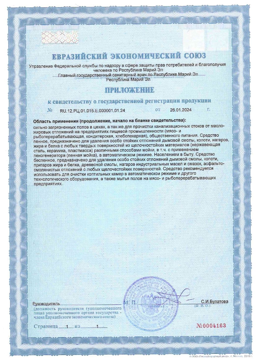 Средство предназначено для удаления особо стойких отложений дымовой смолы, копоти, пригаров жира и белка, древесной смолы, нагаров индустриальных масел и смазок, асфальто-смолянистых отложений с любых щелочестойких поверхностей.