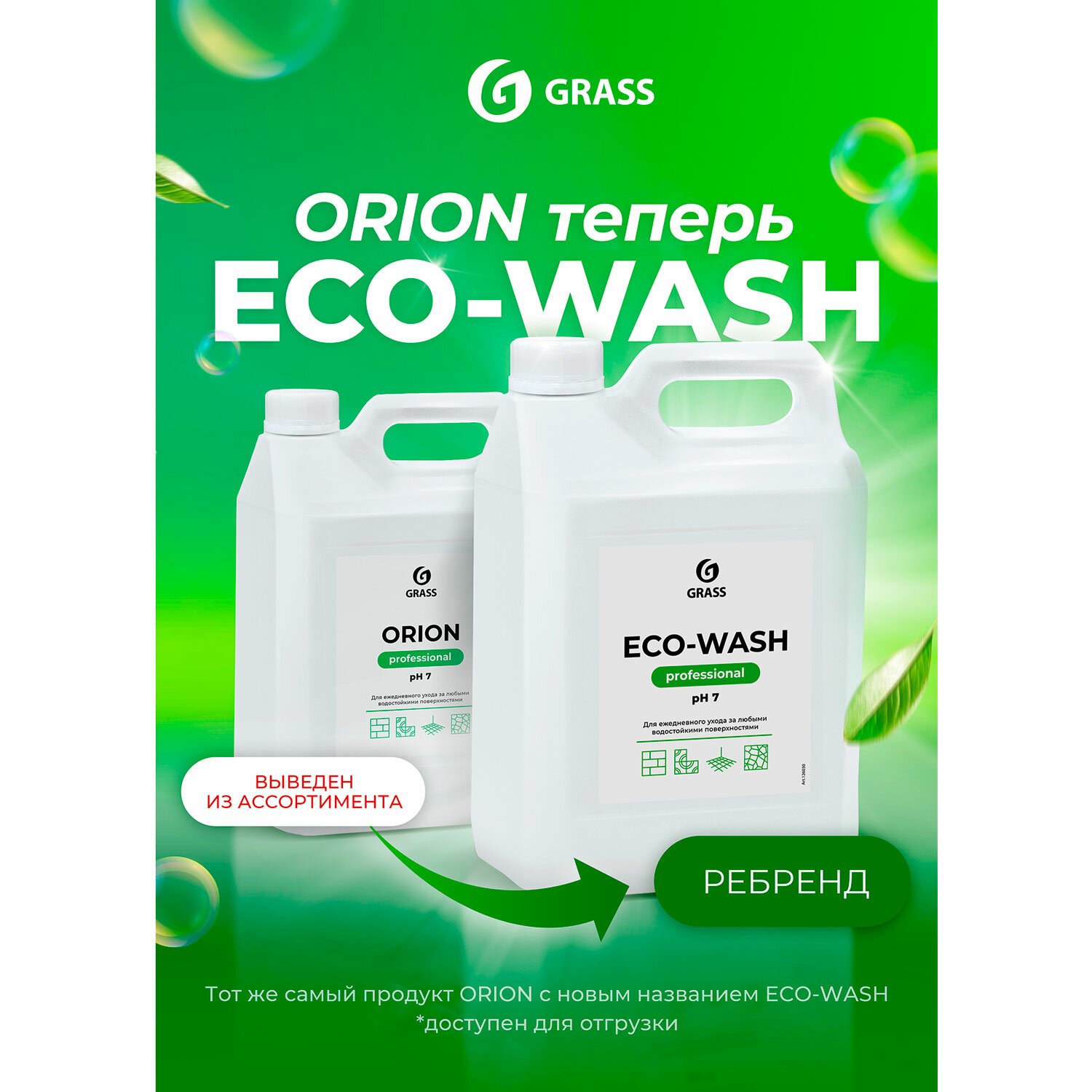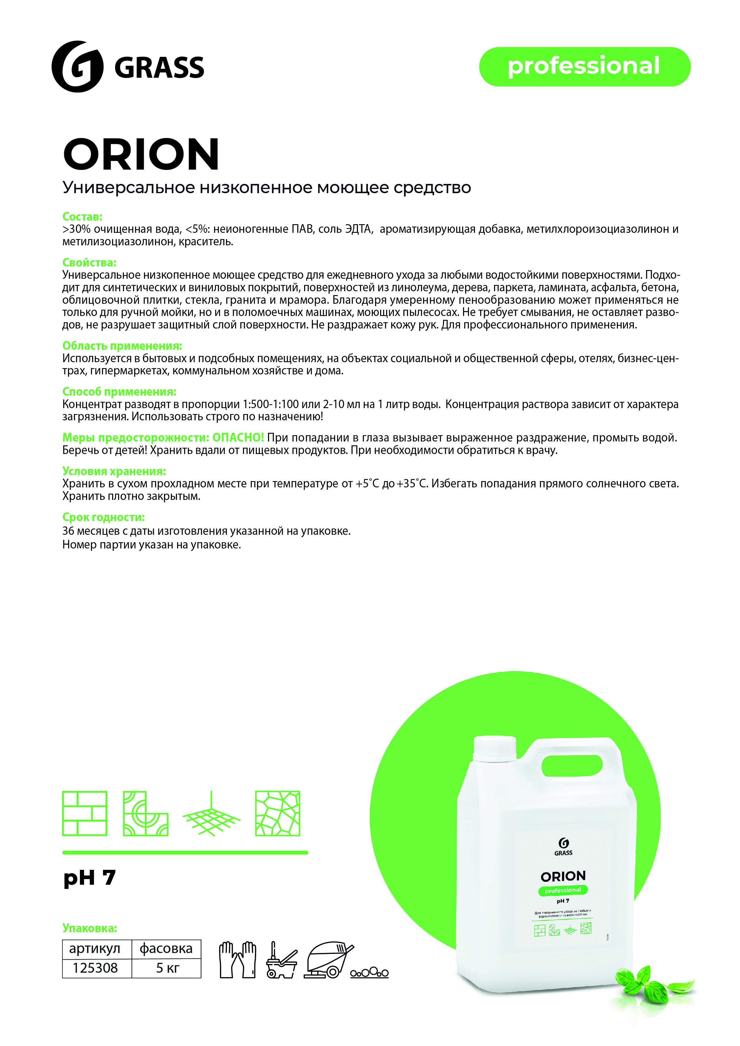 GRASS ORION - универсальное низкопенное моющее средство для ежедневного ухода за любыми водостойкими поверхностями.