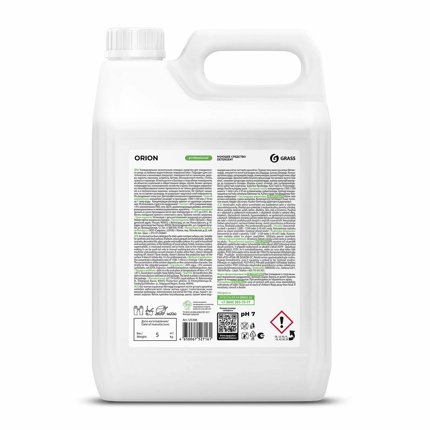 Средство моющее универсальное 5 кг, GRASS ORION, низкопенное, жидкое, 125308