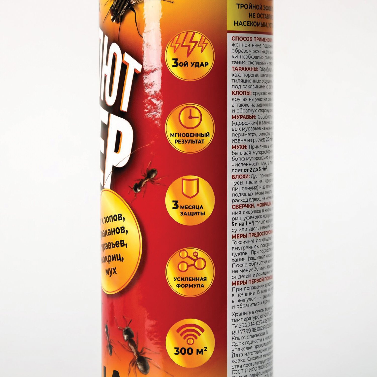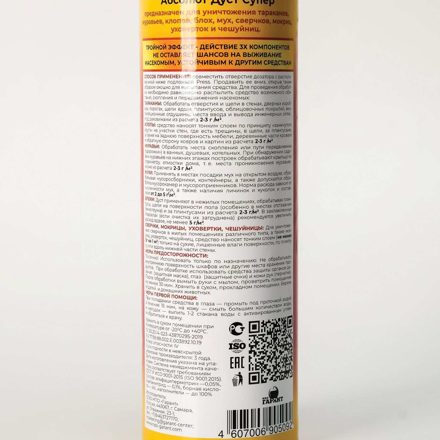 ТРОЙНОЙ ЭФФЕКТ - действие 3 компонентов не оставляет шансов на выживание насекомым, устойчивым к другим средствам. Средство "АБСОЛЮТ ДУСТ СУПЕР" предназначено для уничтожения тараканов, муравьев, клопов, блох, мух, сверчков, мокриц, уховерток и чешуйниц.