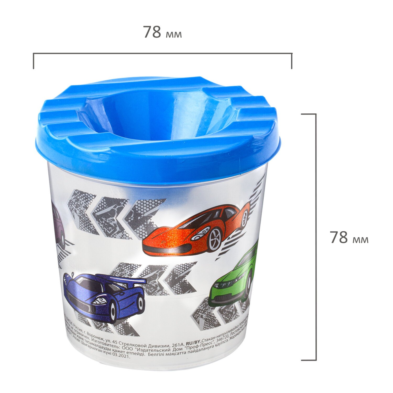 Специальная форма крышки стакана исключает возможность вытекания воды. Линия на прозрачном корпусе указывает на максимально возможный уровень наполнения. Выполнен из прочного пластика. Имеются специальные углубления на крышке для размещения кисточек. Полный объем - 210 мл. Объем до уровня - 75 мл. Оригинальный дизайн сделает процесс рисования еще более увлекательным.
