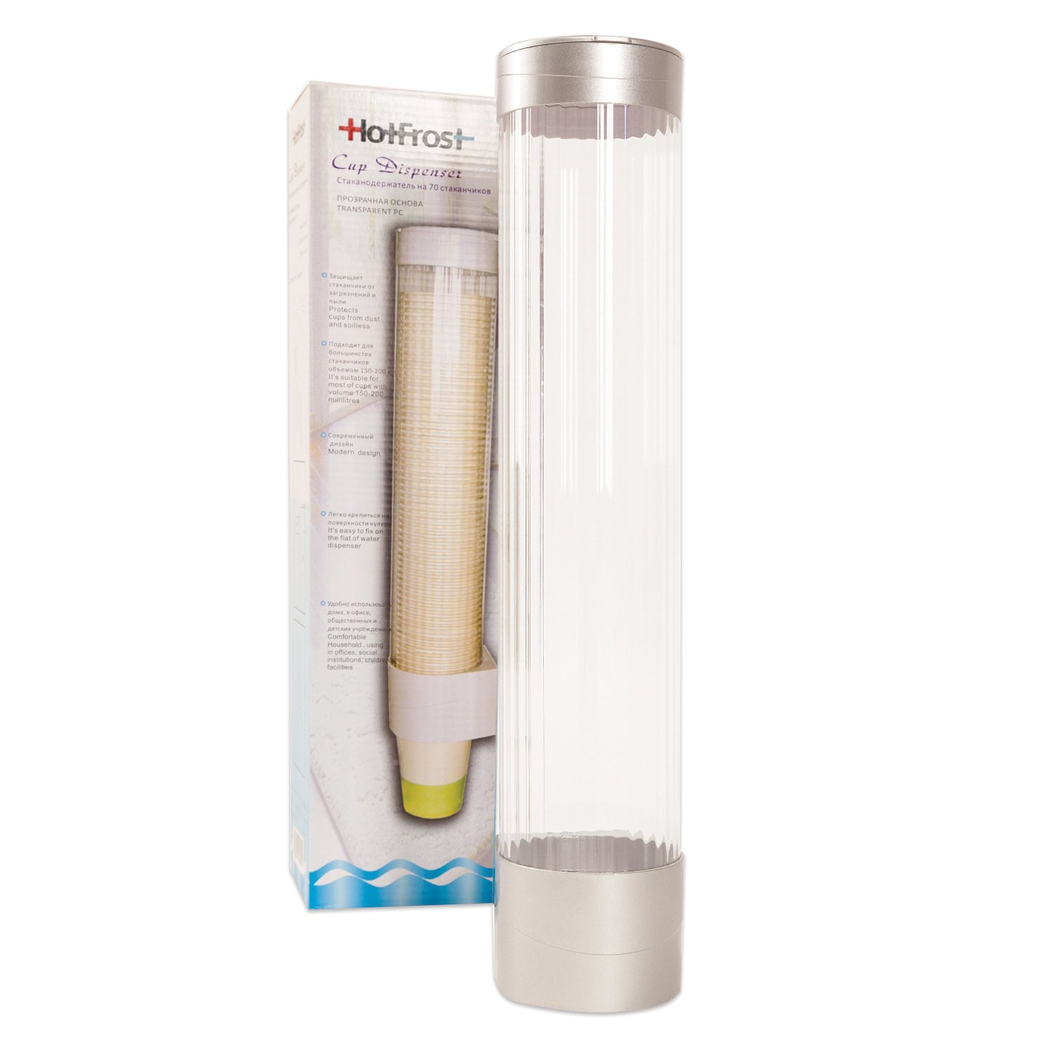 Распределительный механизм внизу футляра отделяет стаканы один от другого, выдавая по одному. Подстаканник рассчитан на 70 стаканчиков. Ёмкость для стаканчиков изготовлена из прозрачного пластика, а крышка и крепёжная часть из пластика серебристого цвета.
