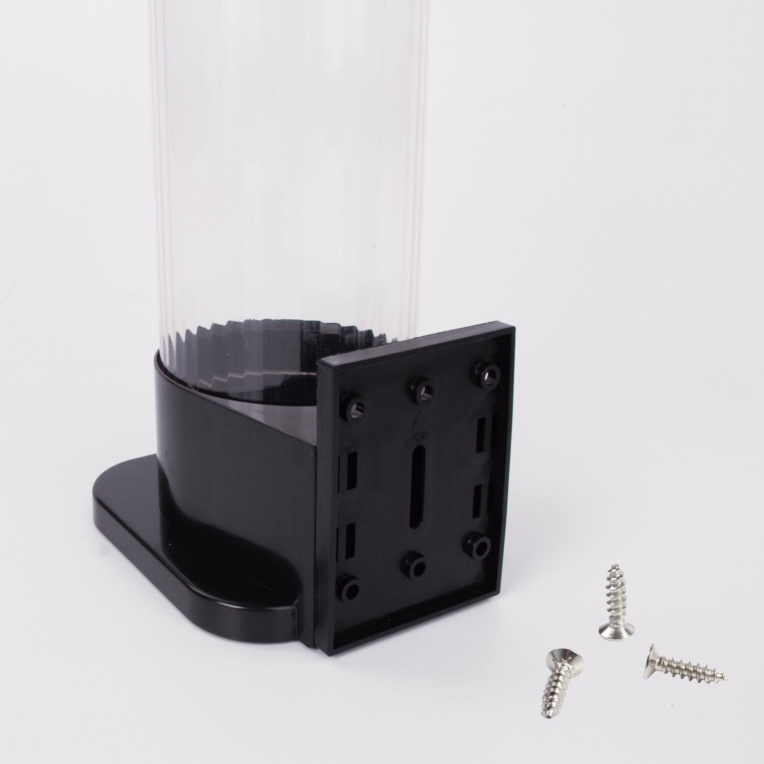 Крепится на корпус кулера с помощью 2-х винтов. Распределительный механизм внизу футляра отделяет стаканы один от другого, выдавая по одному. Ёмкость для стаканчиков изготовлена из прозрачного пластика, а крышка и крепёжная часть из пластика черного цвета и вмещает 70 стандартных пластиковых стаканов объемом 200 мл. Комплект поставляется в цветной ламинированной картонной коробке. Размер - 40х12х11 см.