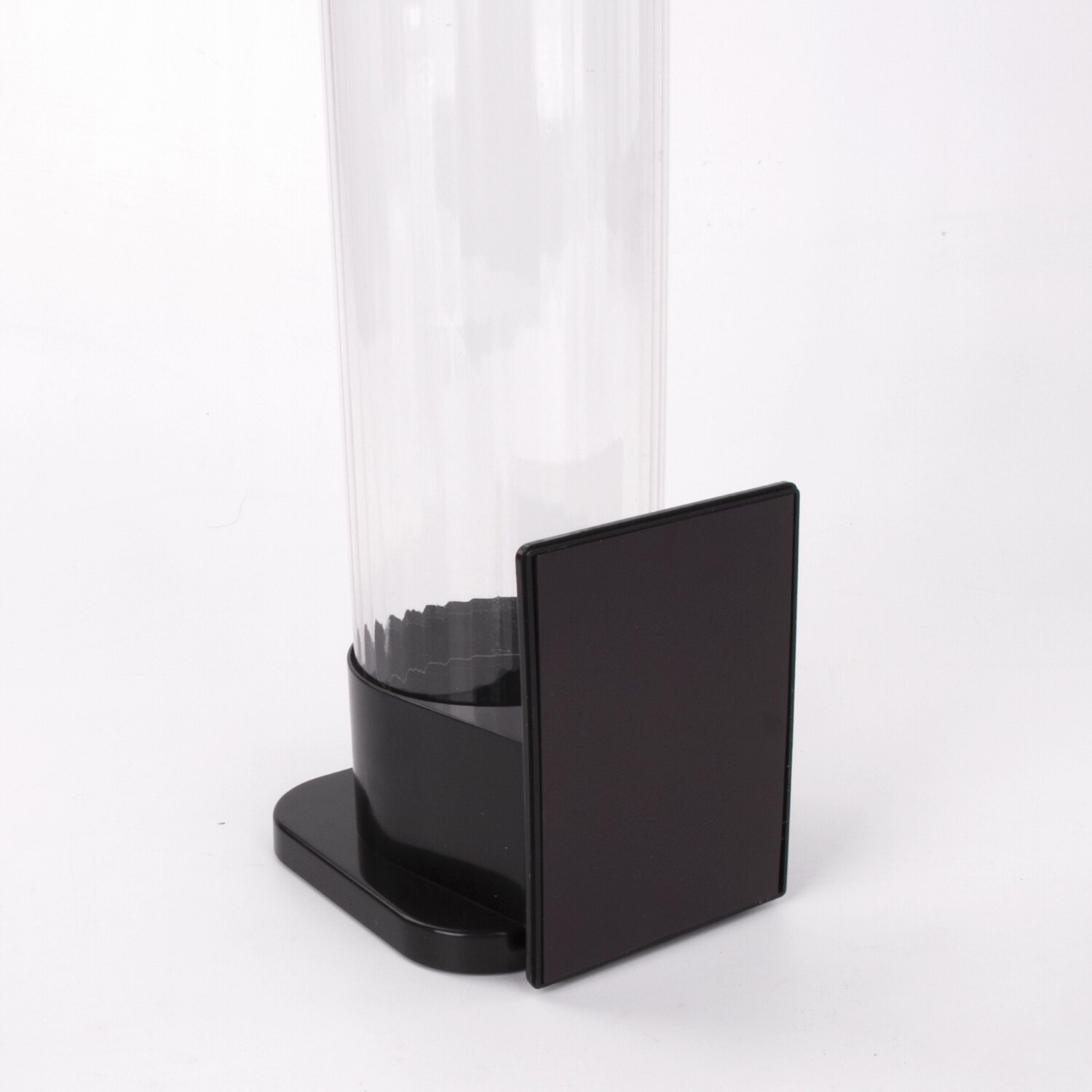 Крепится к кулеру при помощи магнитов. Распределительный механизм внизу футляра отделяет стаканы один от другого, выдавая по одному. Ёмкость для стаканчиков изготовлена из прозрачного пластика, а крышка и крепёжная часть из пластика черного цвета и вмещает 70 стандартных пластиковых стаканов объемом 200 мл. Комплект поставляется в цветной ламинированной картонной коробке. Размер - 40х12х11 см.