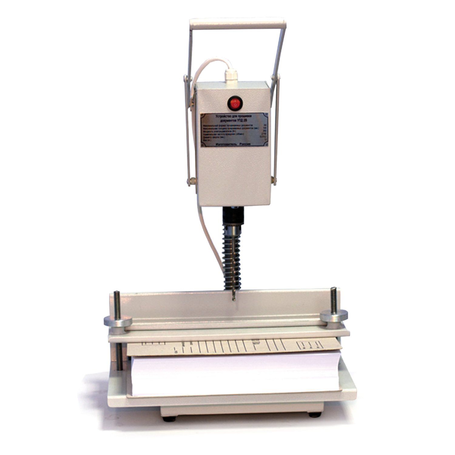 Устройство для подшивки документов УПД 2В представляет собой сверлильный станок для пачек бумаг толщиной до 100 мм, состоящий из перемещаемой струбцины и электрического привода со сверлильным патроном. Сверление пачек бумаг осуществляется с использованием рычага поэтому при работе нет необходимости прилагать большие усилия.