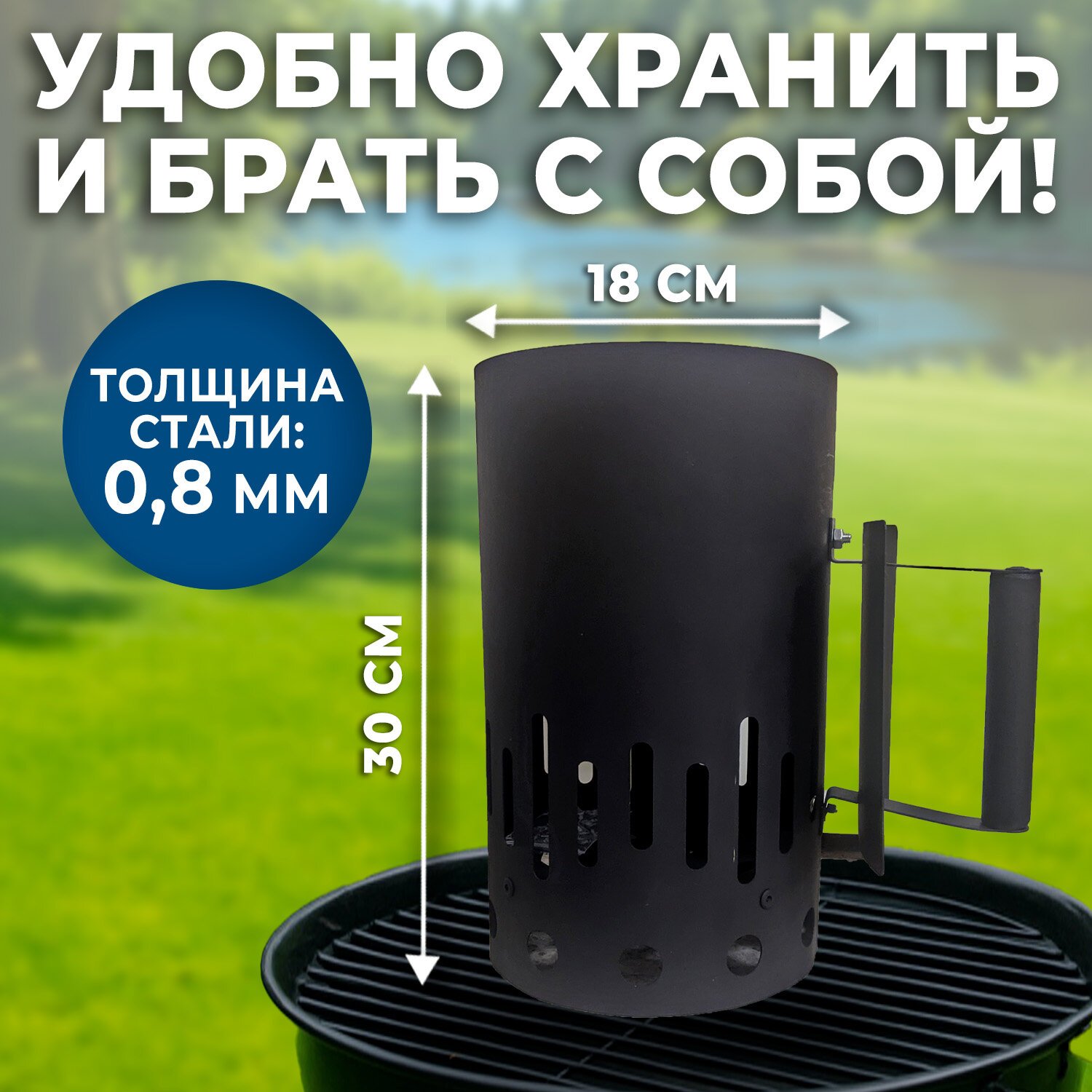 Стартер для розжига изготовлен из х/к стали. Оптимальный размер 19х19х30 см сокращает время розжига углей в 3-4 раза. Снижает риск возгорания и способствует уменьшению количества дыма, делает готовку пищи более комфортной и приятной.