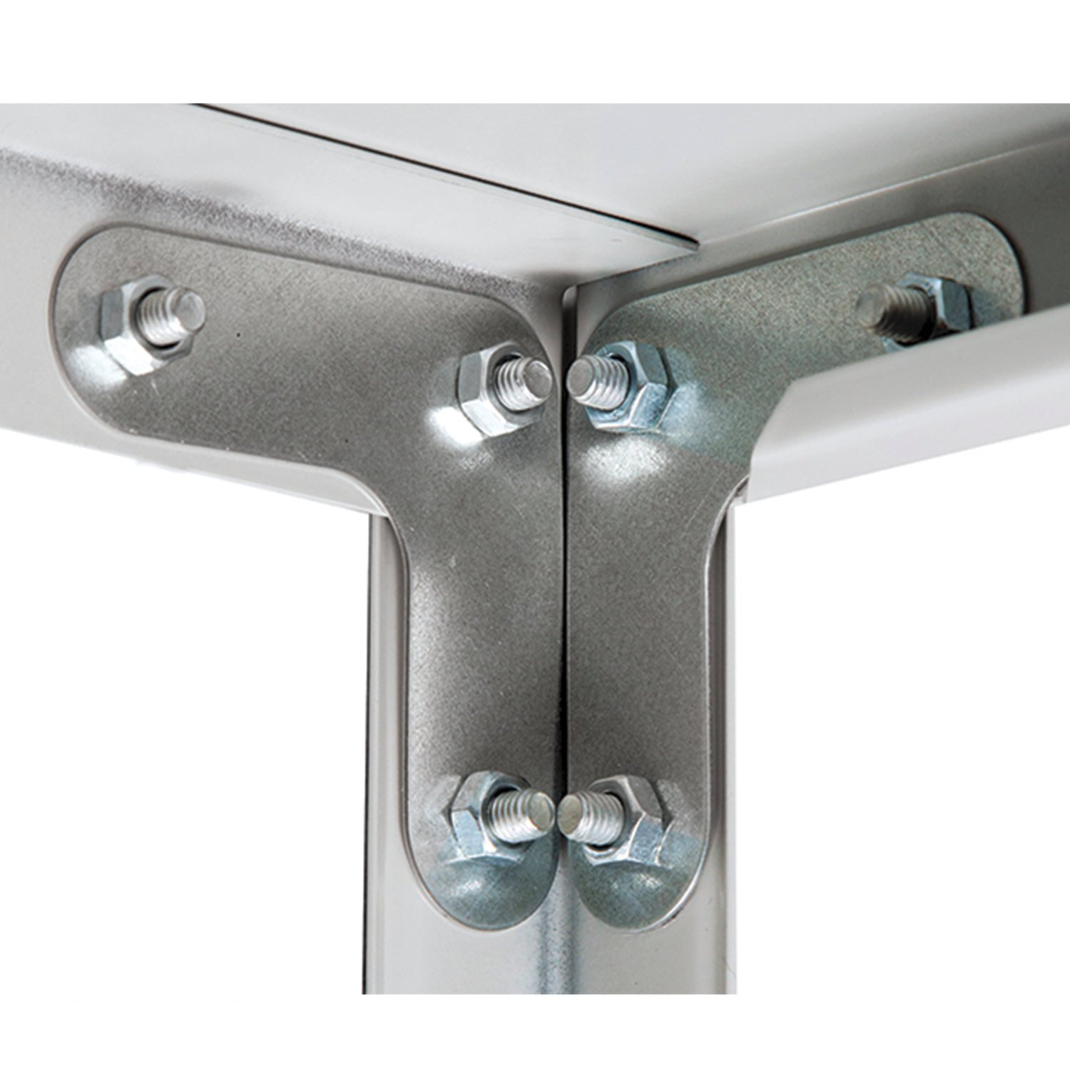 Для повышения жесткости всей конструкции верхняя и нижняя полка усилена дополнительными Г-образными уголками.