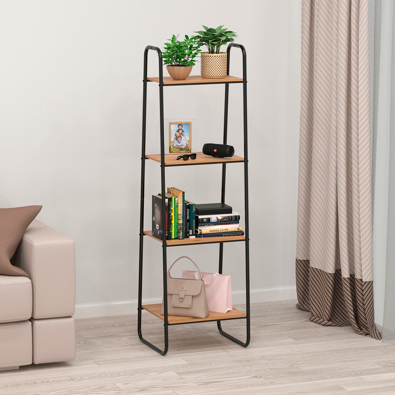 Стеллаж на металлокаркасе "Скандинавия-24", 650х385х1470 мм, 4 полки ЛДСП, черный/дуб, CТCП24 Ч