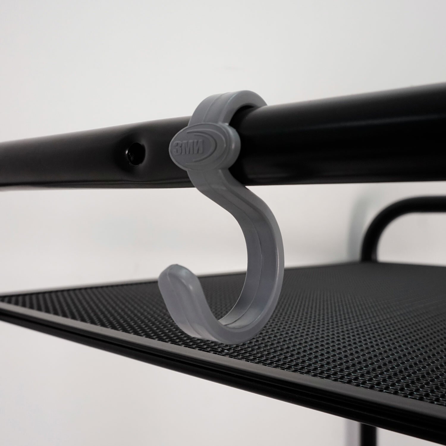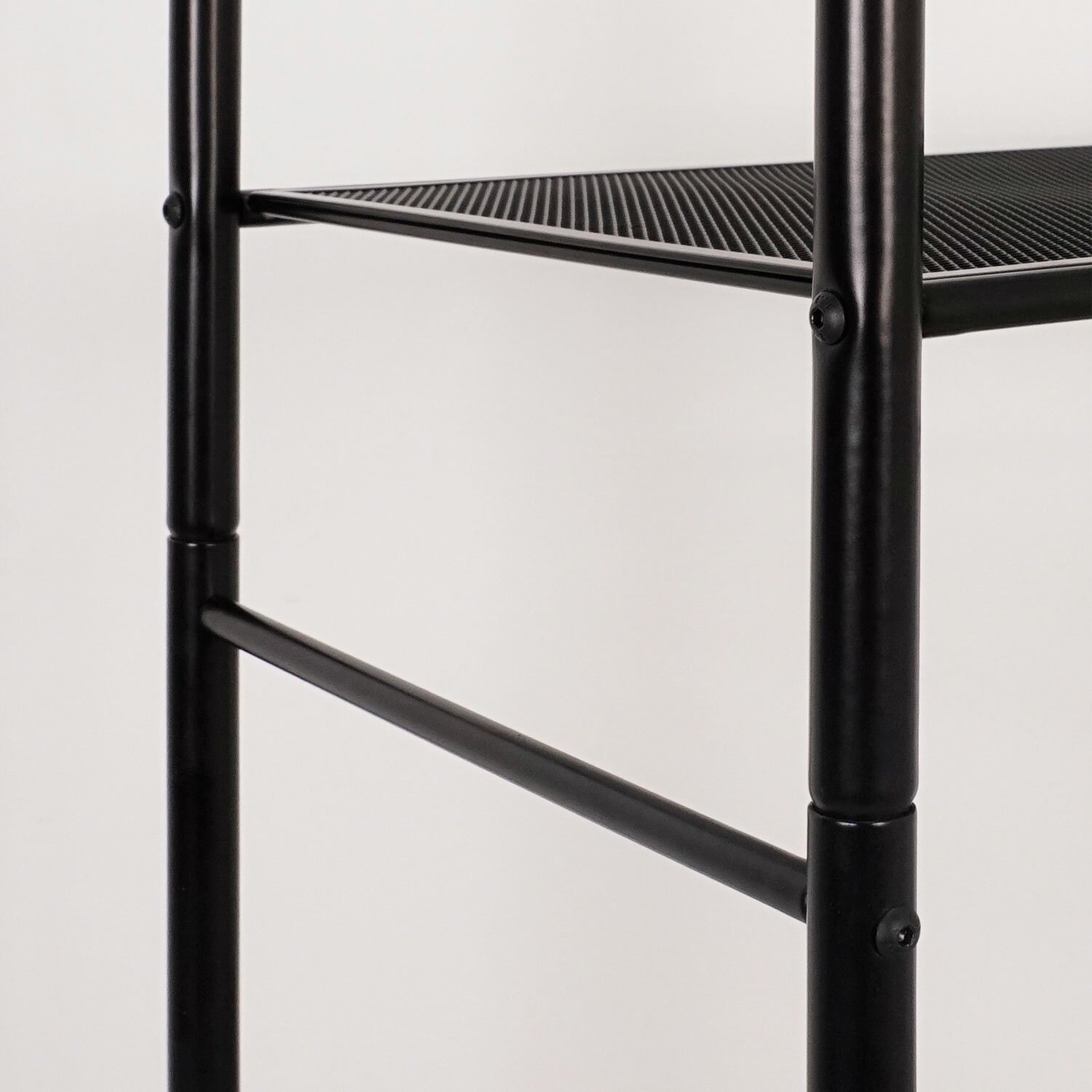 Стеллаж выполнен из прочной металлической трубы диаметром 25 мм и стального листа в мелкую сетку.