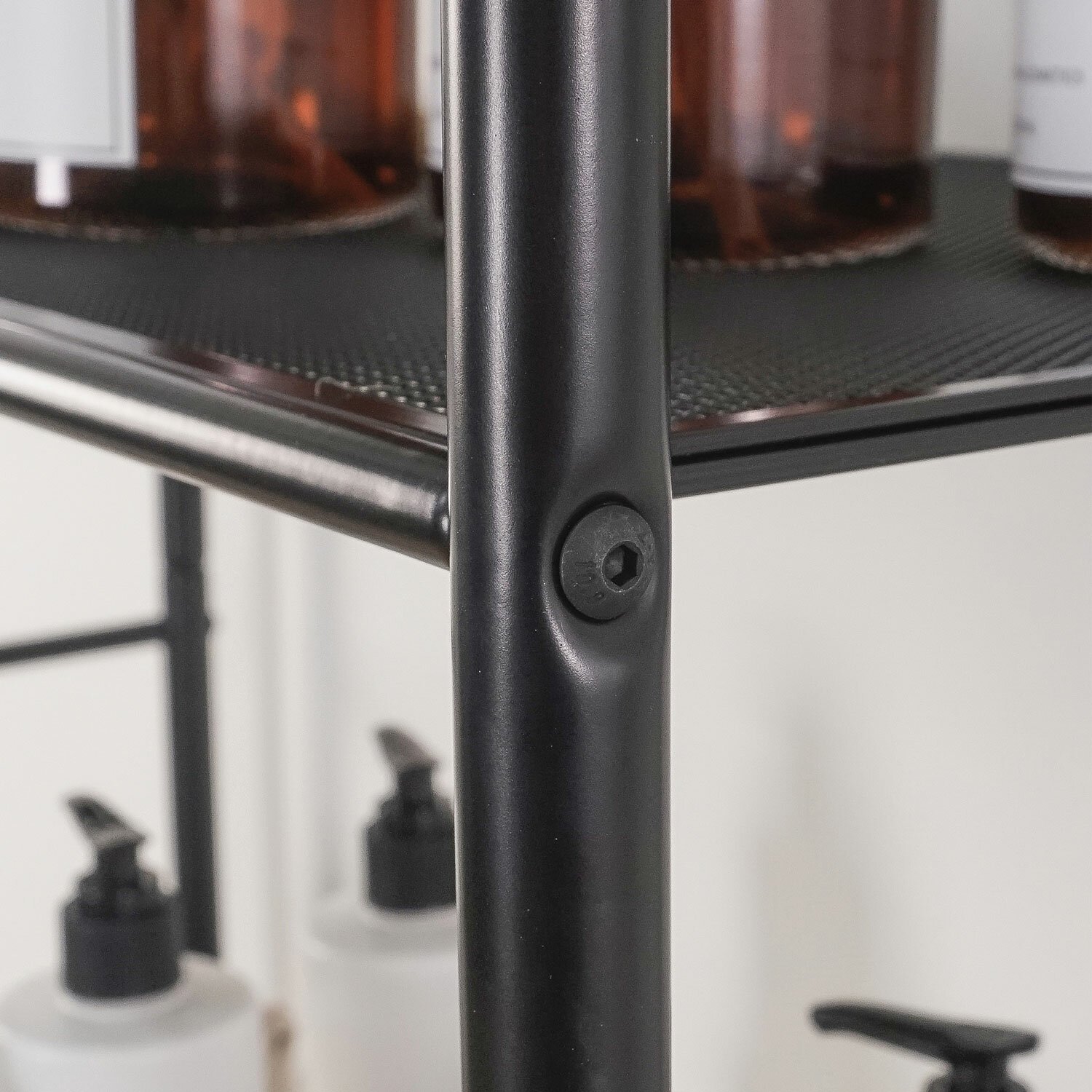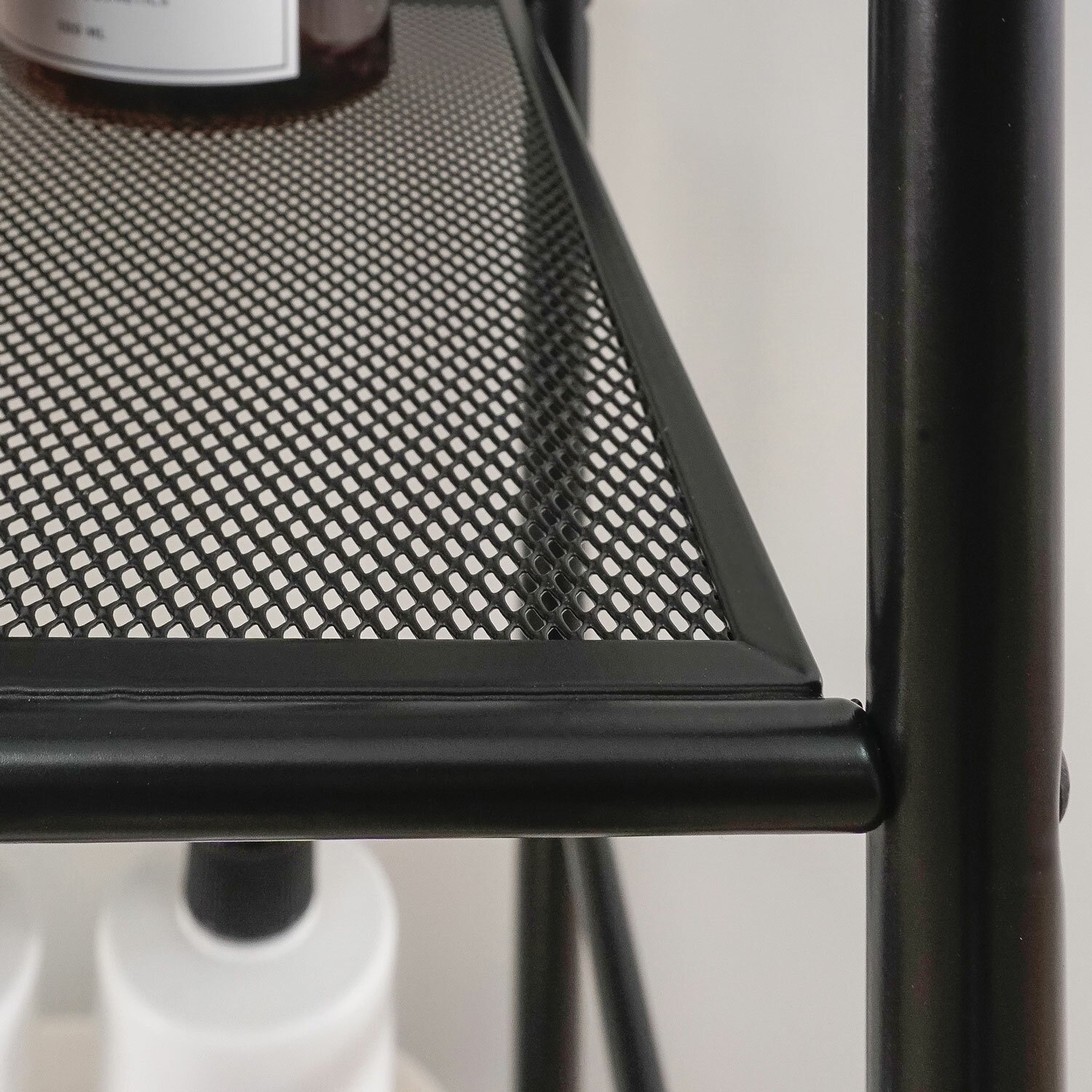 Стеллаж выполнен из прочной металлической трубы диаметром 25 мм и стального листа в мелкую сетку.