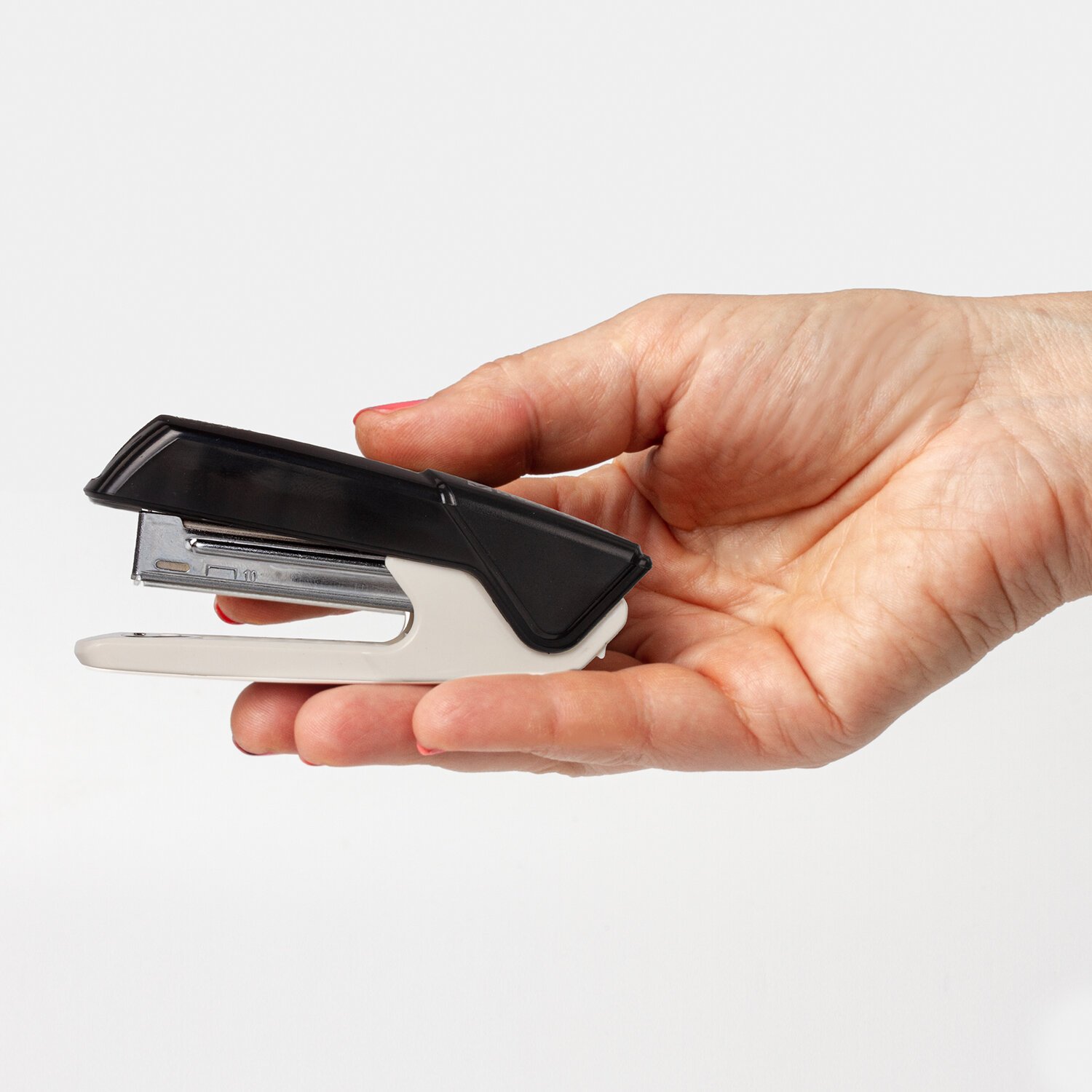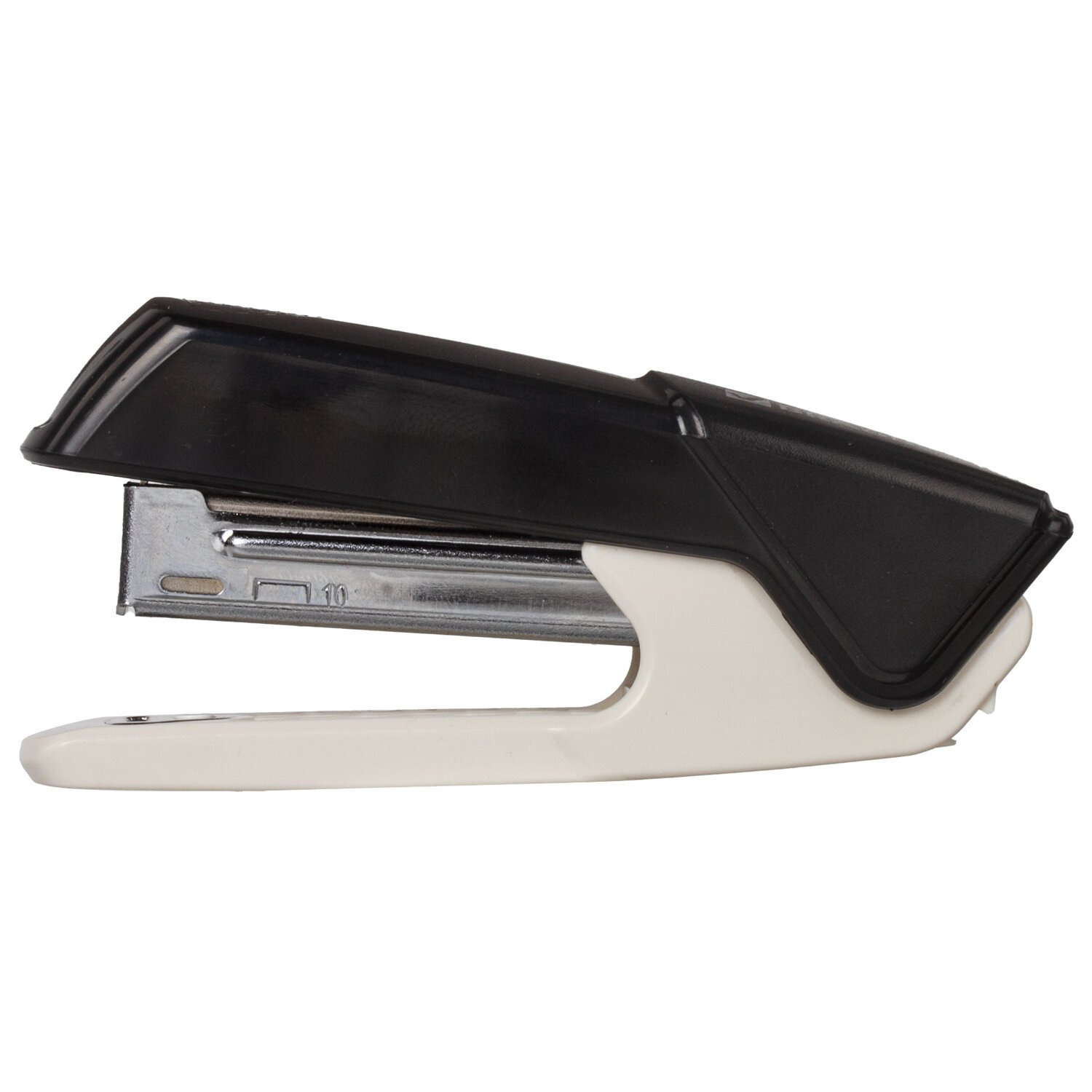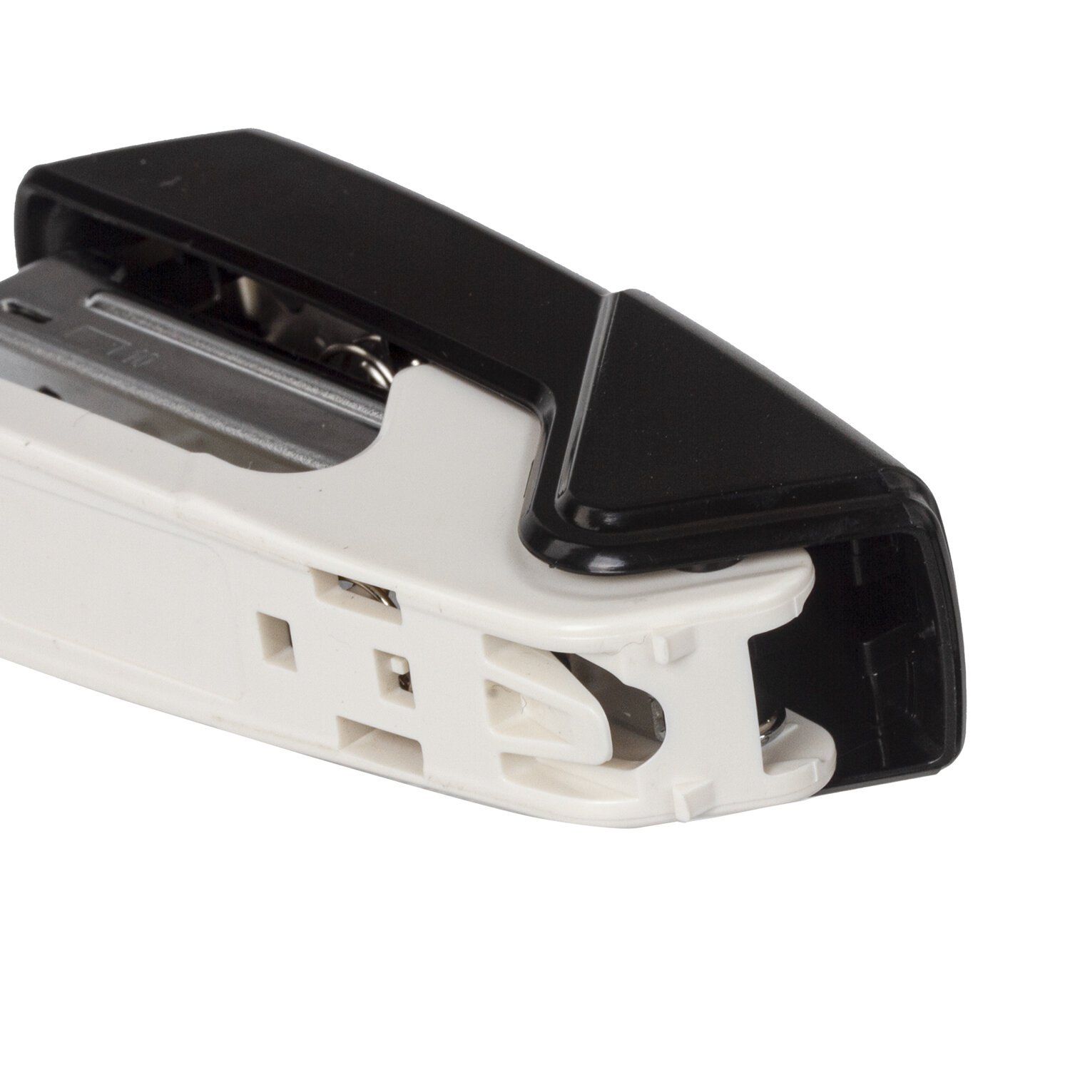 Способен скрепить до 15 листов. Стандартный размер скоб №10. Глубина закладки бумаги - 46 мм. Виды сшивания: закрытый, прямой. Данная модель может выступать в качестве антистеплера, позволяющего разжать закрепленные скобы более качественно, не нанося повреждений ни материалу, ни кончикам пальцев. За счет компактных размеров не займет на рабочем столе много места. Имеет стильный дизайн и комбинированный цвет. Для удобства при использовании присутствует антискользящая ребристая вставка.