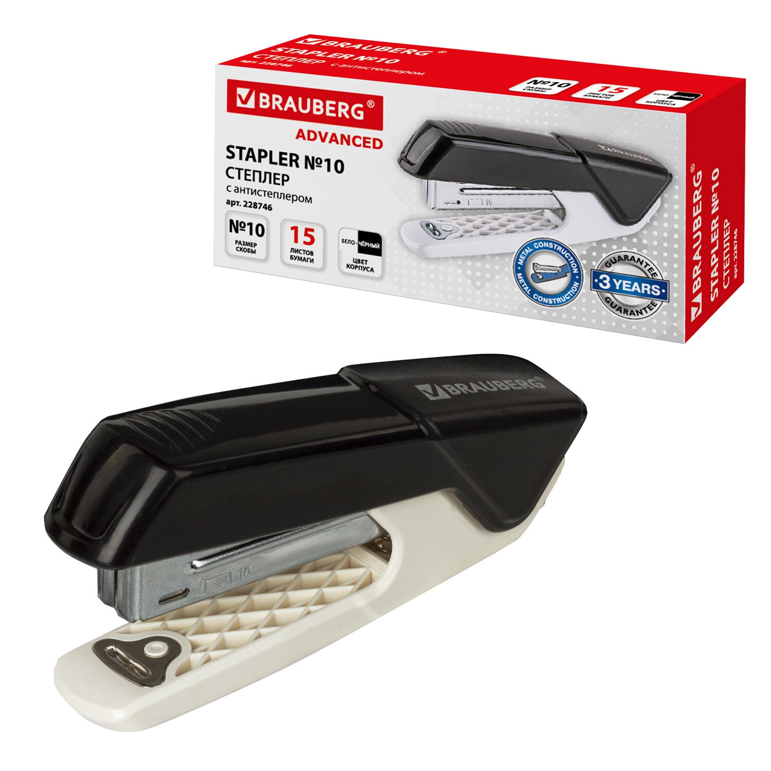 Степлер №10 BRAUBERG "ADVANCED", до 15 листов, с антистеплером, черный, 228746